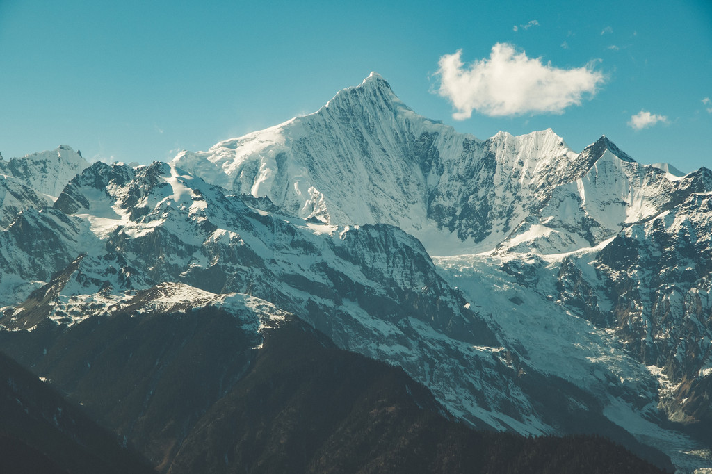 中午我们到了德钦,我们的酒店建在雾浓顶观景台,这是观赏梅里雪山的一个好位置,在县城吃过饭,先去了飞来寺,这也是观赏雪山的一个好位置,从距离上看飞来寺离雪山更近些。午后的阳光很明媚,包裹着白雪皑皑的高峰,几朵小白云浮在半空恰好点缀了巍峨的群山。梅里雪山的最高峰卡瓦格博峰海拔高度为6740米,是云南省最高的山峰,至今没有被征服,美丽的雪山披着圣洁而神秘的面纱,日复一日伫立在那里,接受着四方朝觐。我们的照片只能体现神山气势之万一,如有机会还是推荐小伙伴们亲身体味那种神圣,开阔的心境!
