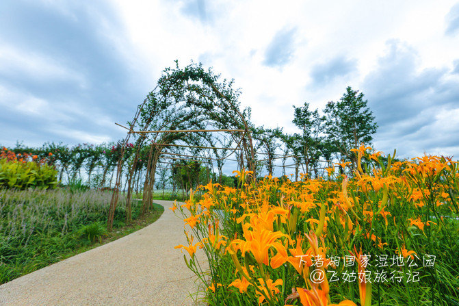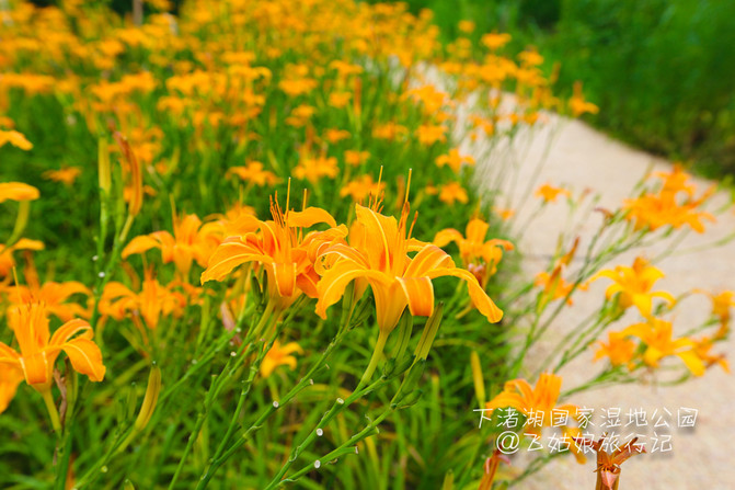 花廊的另一头又是一片花海,金灿灿的,这大概是金针花吧?