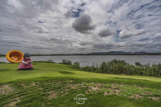 从湖中看第三座小岛,并没有太高的树木和建筑,相对于朱鹮岛会平坦许多,远远就能看到一个巨大的黄色帽子和前面一个粉色小裙子的姑娘,我喜欢这里的这片草地,虽然坐上去还有些扎屁股,但坐着吹吹风看看远处的风景,一扫平日里的疲惫,会有些神清气爽的感觉。
