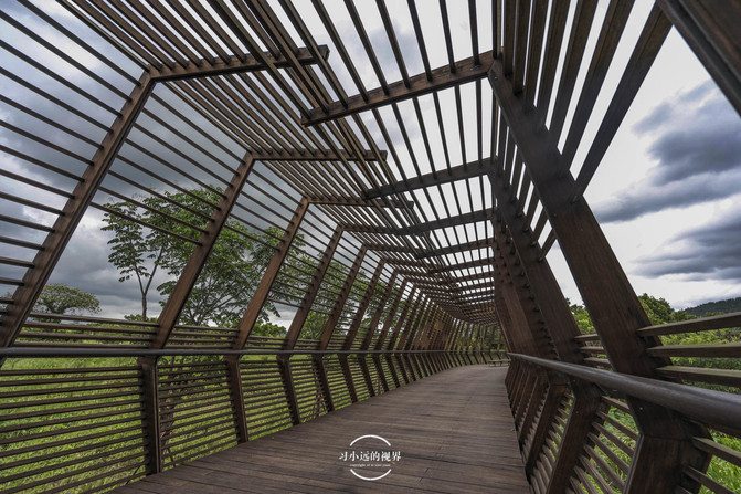 带着这样的感觉就把第一个岛逛起来了,逛完之后发现这里有三个不错的地方,一个就是最高点三层的观景台,站在最高层,实现非常好,可以看到整个小岛的全景,迷宫,吊脚竹楼,两个游船码头,还有自由飞翔的鸟儿,正值台风时段,这里360度的自然风也是吹着特别凉爽,加上天空云层很低,移速又快,对于一个摄影师来说,无非这里是一个出片的好地方,照片延时摄影都不错。
