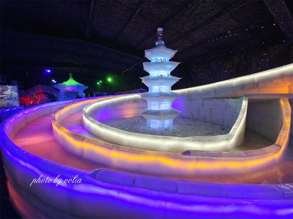 下渚湖冰雪世界占地面积1000平方米,里面的冰雕作品都是由2018年哈尔滨冰雕大赛金奖获得者团队操刀雕刻。每一个都栩栩如生,巧夺天工。
