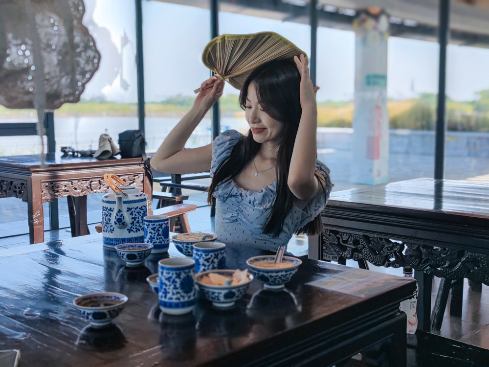 三道茶解暑消渴登岛乘船,乘船登岛,辗转游玩了7、8个小岛,最后一个岛上有一间“丈母娘茶寮”。它似乎读懂了游客的疲惫,已经准备好了“下渚湖三道茶”。