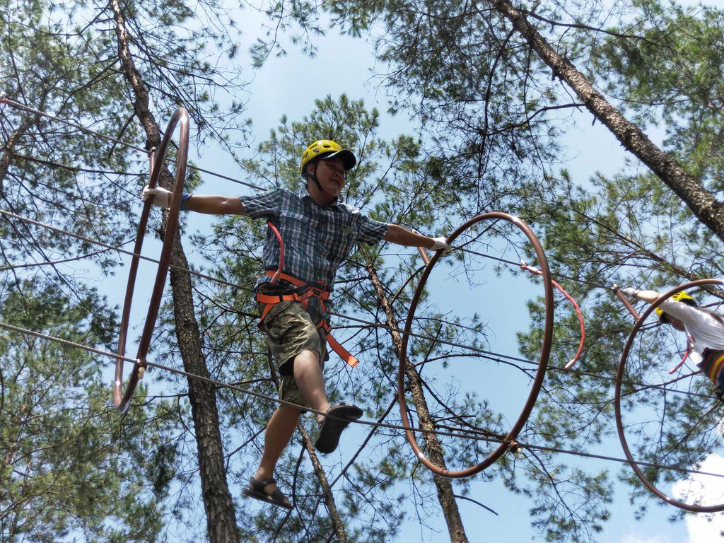 大茅山冒险森林,大人小孩皆宜的冒险活动。成人有成人的丛林穿越之旅,小朋友有儿童的穿越之路。穿上安全设备,在教练的指导下,一关一步一脚印,开始了就不再回头。