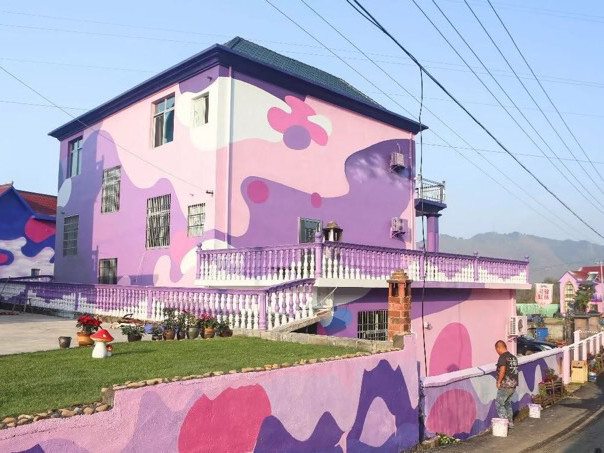 过了桥洞,进到村中,满眼的彩虹童话屋,墙面彩画与风景相印成趣,赋予村庄活力,将游客与村庄的互动激发出来。