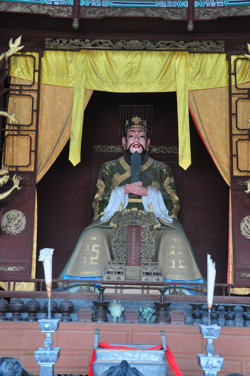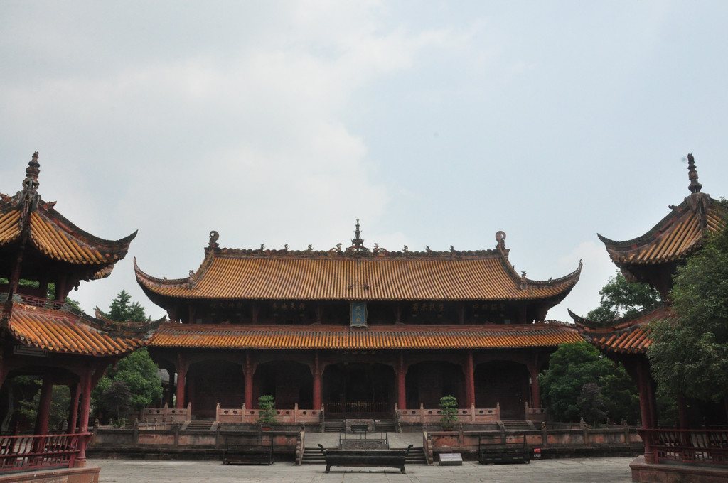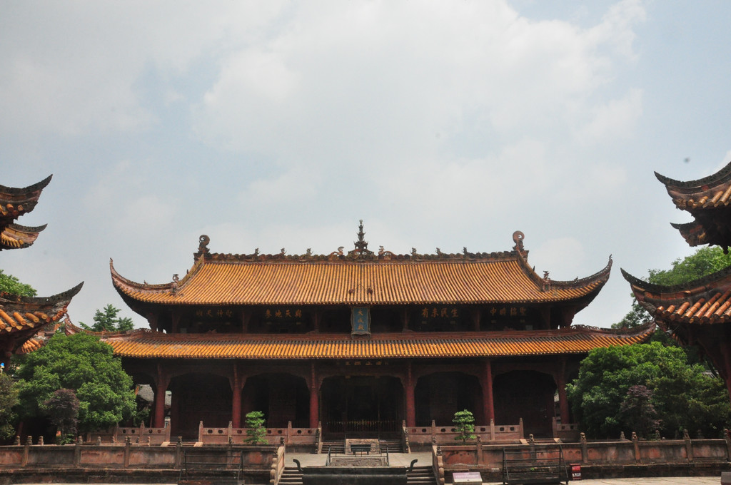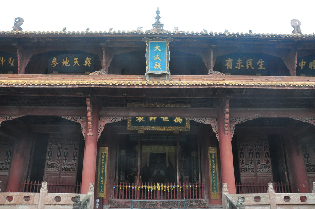 德阳文庙主体建筑大成殿坐落在文庙中院,整个建筑雄伟、庄严、华丽,是文庙庭院中建筑最高、体量最大、保存较为完好的一座古建筑,它建于清道光三十年(1850年),是文庙的主体建筑,面阔七间33.97米,进深四间14.78米,通高21米,为重檐歇山式屋顶,屋面系黄色琉璃瓦覆盖,正脊饰以飞龙,中间置宝顶。殿内有孔子、四配、十二哲塑像和祭孔祭器、礼器、乐器陈列,有烛台、爵、镫、笾、簋、豆、硎等祭器、礼器,牛、羊、豕三牲俎,以及祭孔时演奏中和韶乐的编钟、搏钟、编磬、特磬、琴、瑟、箫、笛、埙、鼓、祝(起乐之器)、敌(终乐之器)等乐器及指挥乐舞场面的麾、节等。殿前有宽阔的拜台,可观赏场面盛大、古朴典雅的仿古祭孔乐舞。清代以来,大型祭孔活动,每年两次,时间为每年仲春上旬丁日和仲秋上旬丁日。1990年以来,德阳文庙按照清代格局和礼制恢复了祭孔乐舞表演。