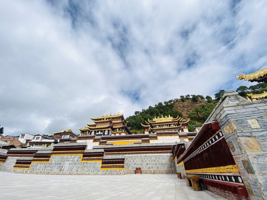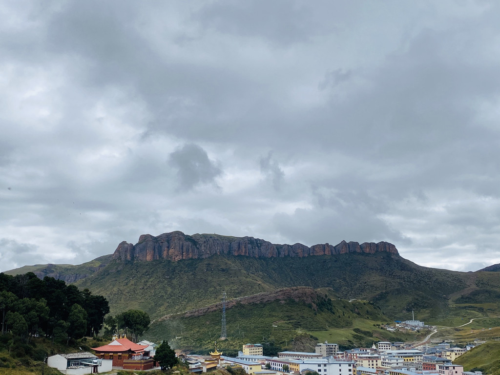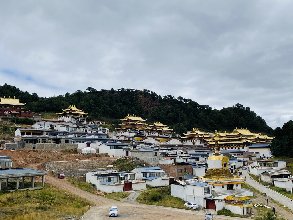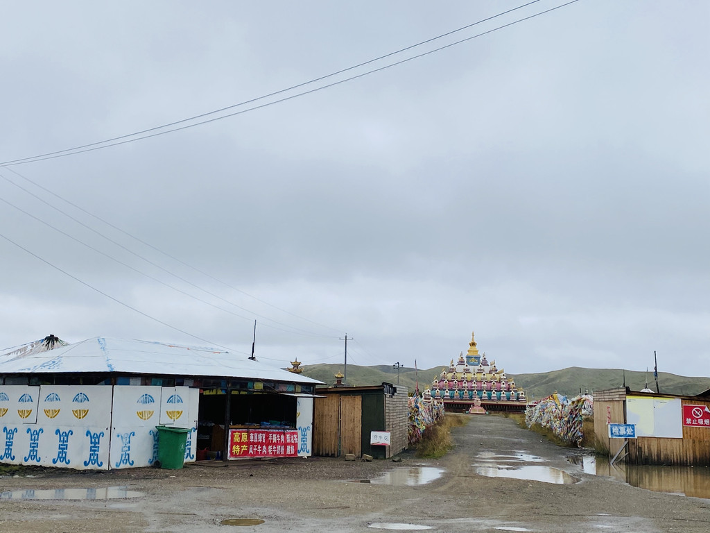 出发的时候天气并不好,原来就打算在郎木寺打卡一下就走的。跟着导航到了地方,怕街道内部开车不便(两个方向都是上坡),就在外围停了车(也没人收费)。步行进去一公里的样子,见到了甘肃郎木寺-甘丹赛赤寺,或者叫达仓郎木寺。免收门票,寺门前的广场都是泥土,雨后天色还有点阴沉,空中盘旋着秃鹫,不断的有当地人过来拉客说可以载我们去天葬台(当天正好有天葬仪式),我们婉拒了(实在是看过评论就知道去了是要做噩梦的,胆小勿入)。寺门那边就可以远观红石崖。