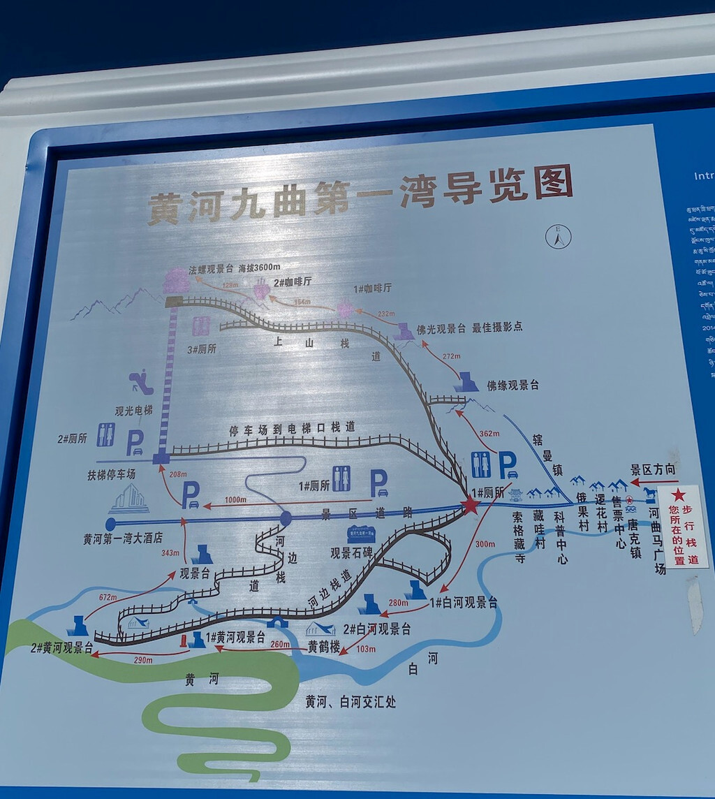 因为太阳落山太快,没能去到下面的线路(即木栈道走到临近黄河边),直接从木栈道攀爬上几个观景台。也比较庆幸之前做了攻略,放弃了乘坐所谓的观光扶梯的项目。因为观光梯只上不下,离栈道下口步行到停车场有不短的距离,停车是个问题。另外观光梯直达最靠近最高的法螺观景台的地方,其实依然要上行一段路,去早了落日还没到最合适的点,去晚了,看完落日,下行的几个观景台就毛线美景也看不着了,所以体力没有节省多少,美景却损失许多。(看看下面的景区导览图就知道了)