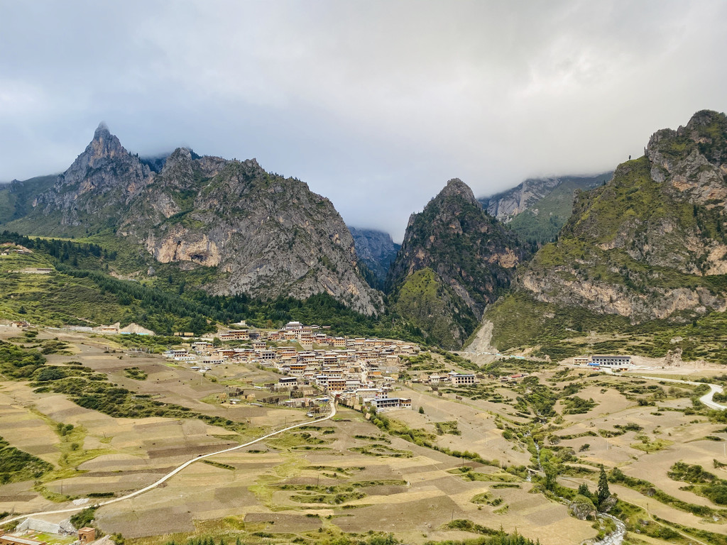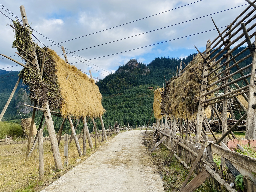 扎尕那观景集中的就是主要四个村(没有专门去扎尕那景区,据说其实里面没什么景点,就是看村落的)。入住业日村一家民宿,出门几步路就是四个观景台之一。进村的路开的心惊胆战(坡陡路窄,难以会车),村里民宿指示不明,探路无果,只能打电话让店主来接。办入住的时候,店主告诉我们,这个时节来扎尕那已经有点晚了,地里的青稞已经全部收割完毕,如果是8月中来看,一片片成熟的青稞层层叠叠,像金色的浪潮,映衬着蓝天白云,是丰收的秋色里最美的扎尕那。现在青稞成片的被悬挂在晾晒架上,据说要等上差不多一个月,才能脱粒,再拿去加工。