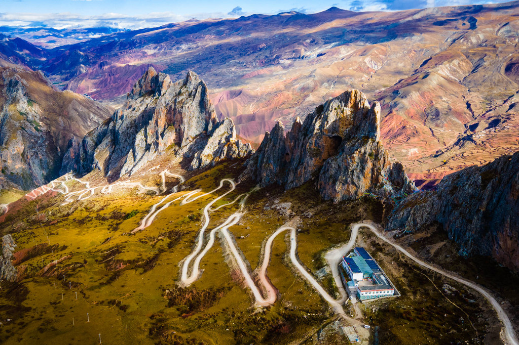 出丁青县城往昌都方向开始,这一段被称为藏东南的红土地,西藏最大的丹霞地貌区域,从孜珠山上眺望,四周一层层彩色的岩石交错包围,与远山相映,与蓝天交接,不悲不喜。