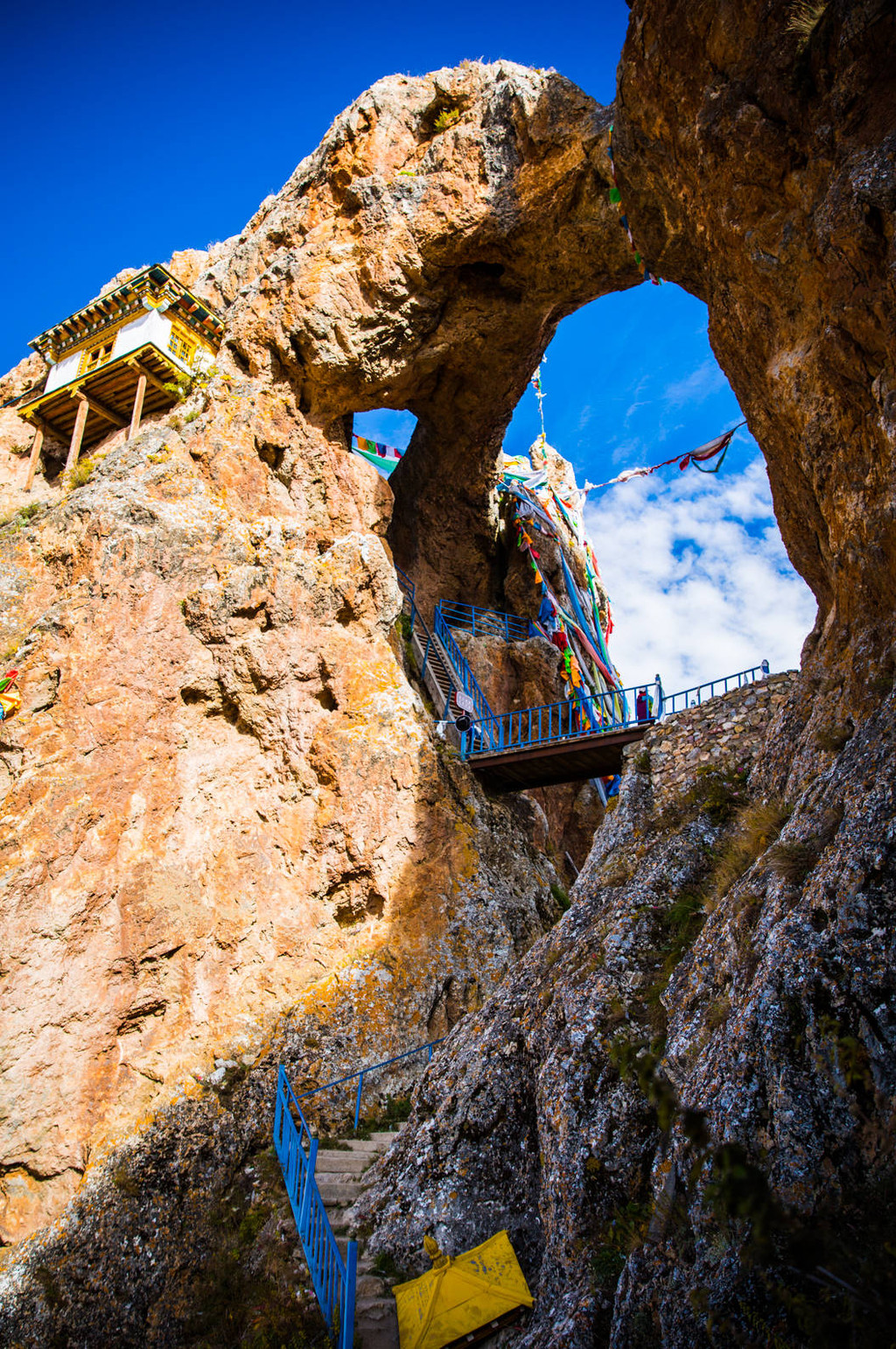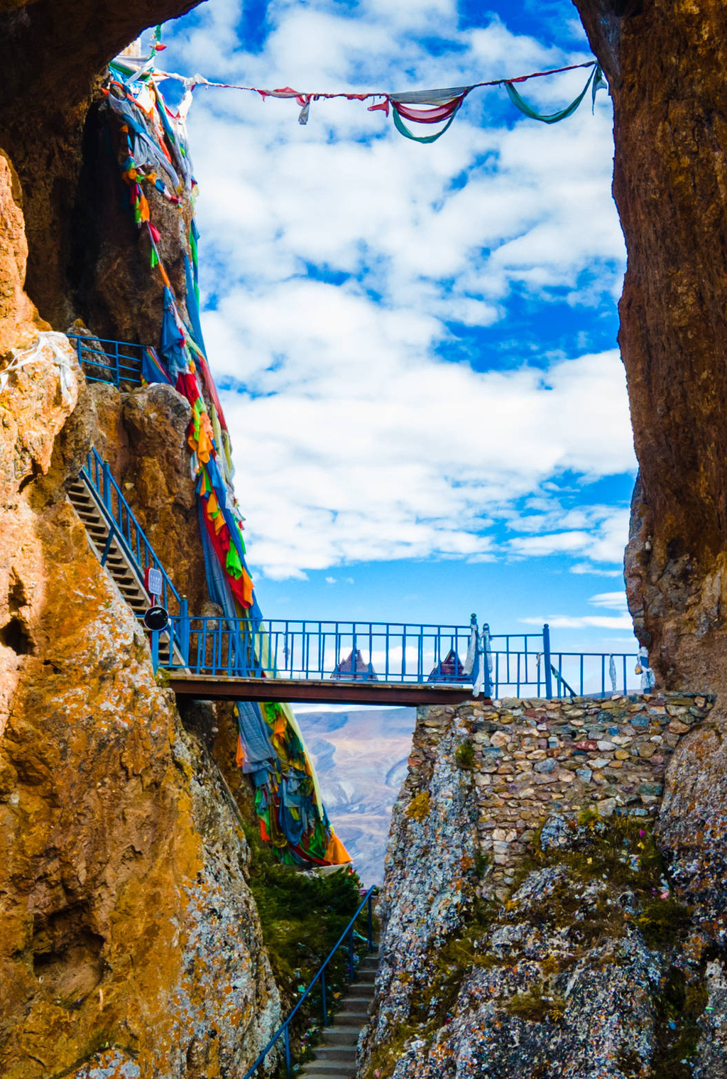 更奇妙的是,僧人们恨不能将禅房修建到山巅。空洞旁边悬崖上的这个修行小屋,最早只是一个山洞,据说象雄国王的王子曾在这里修行,后来建了孜珠寺最高的禅房,或许是不是可以远离尘嚣,心无旁念。