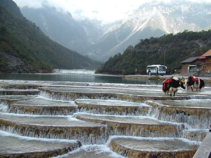 P.S.话说,不知大家是否听过“ 白水 台” ( 香格里拉 附近的景区)这个景点,有点类似于 土耳其 的棉花堡。从虎跳峡到 白水 台有条路,大约两个半小时车程,其中一个多小时就是这样靠近悬崖边的路。我曾经想要走这个路线去 白水 台,但包车老板拒绝了我,说雨季的时候没有司机敢走那条路。在真实经历过虎跳峡摆渡车的这一小段之后,我有点庆幸没走那条路,否则一个多小时吓得心脏病都要犯了。