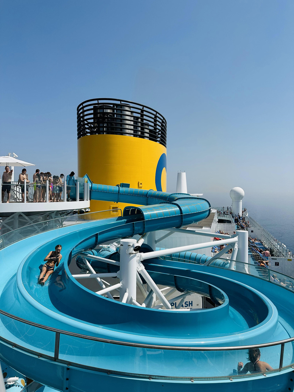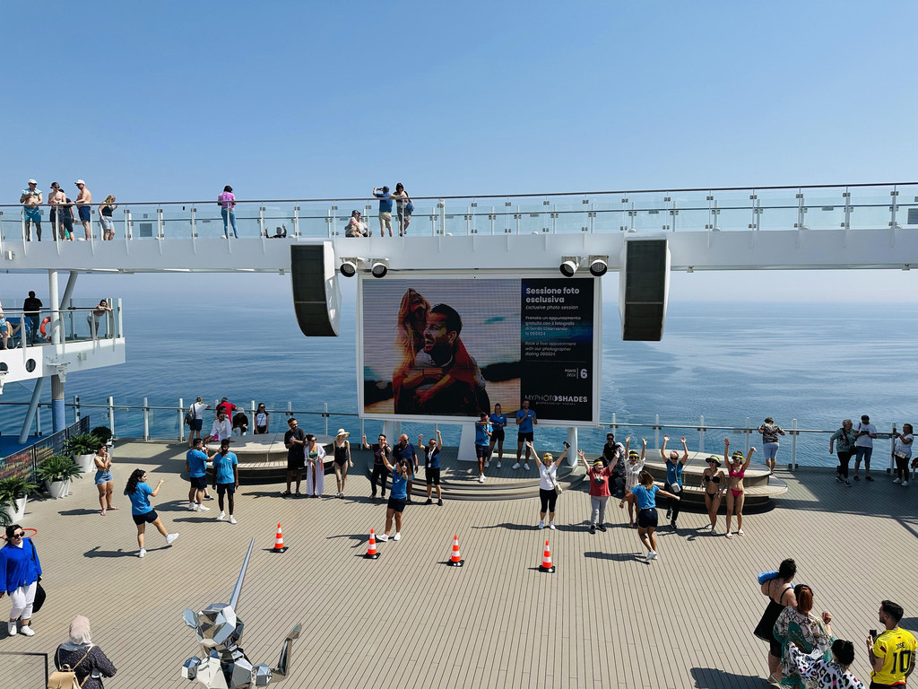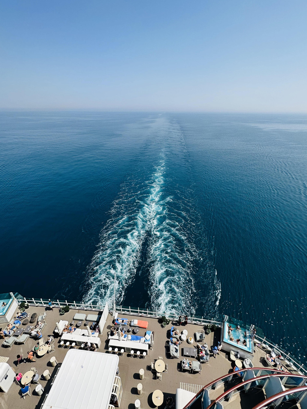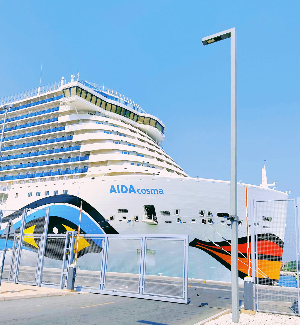 爱达邮轮Cosma号。船体上一张吻嘴,大眼睛,加上蓝色的眼线是爱达邮轮的特征。这家邮轮公司是邮轮行业的龙头老大——嘉年华邮轮的子公司,主营德国市场,95%的乘客都说德语,所以相对来说,爱达邮轮的名气没有其他公司响。