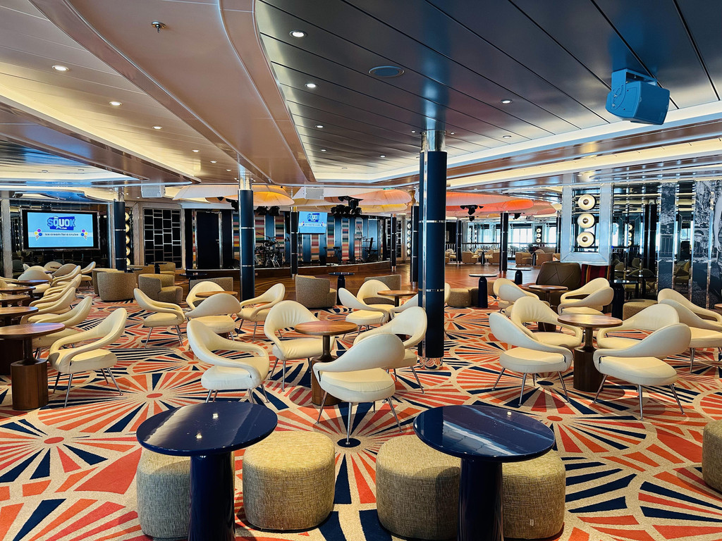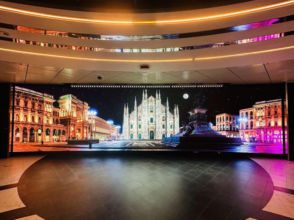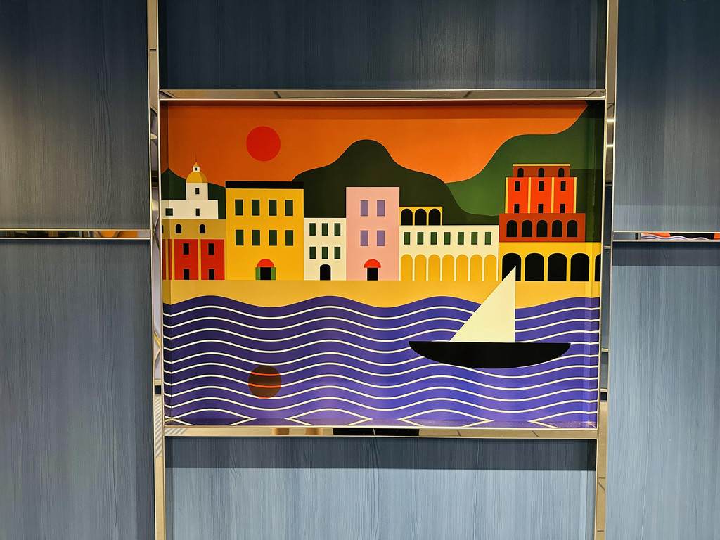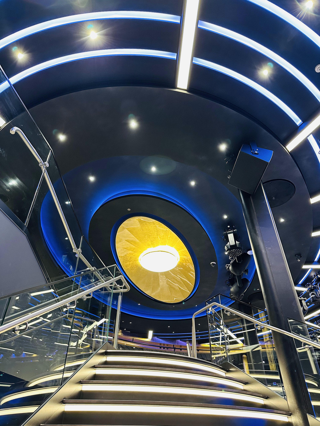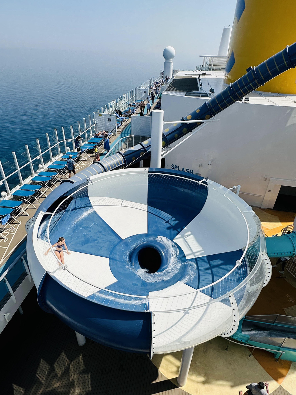 爱达邮轮Cosma号。船体上一张吻嘴,大眼睛,加上蓝色的眼线是爱达邮轮的特征。这家邮轮公司是邮轮行业的龙头老大——嘉年华邮轮的子公司,主营德国市场,95%的乘客都说德语,所以相对来说,爱达邮轮的名气没有其他公司响。
