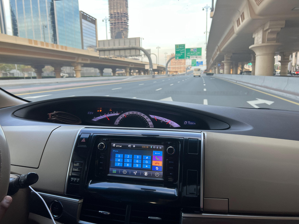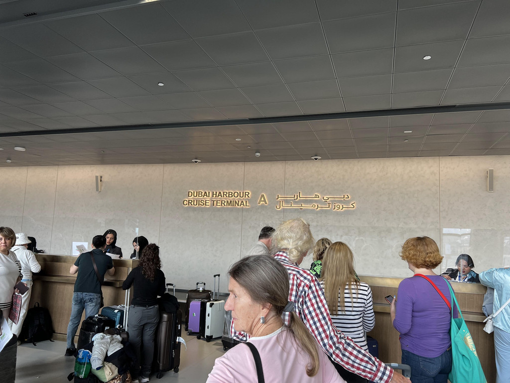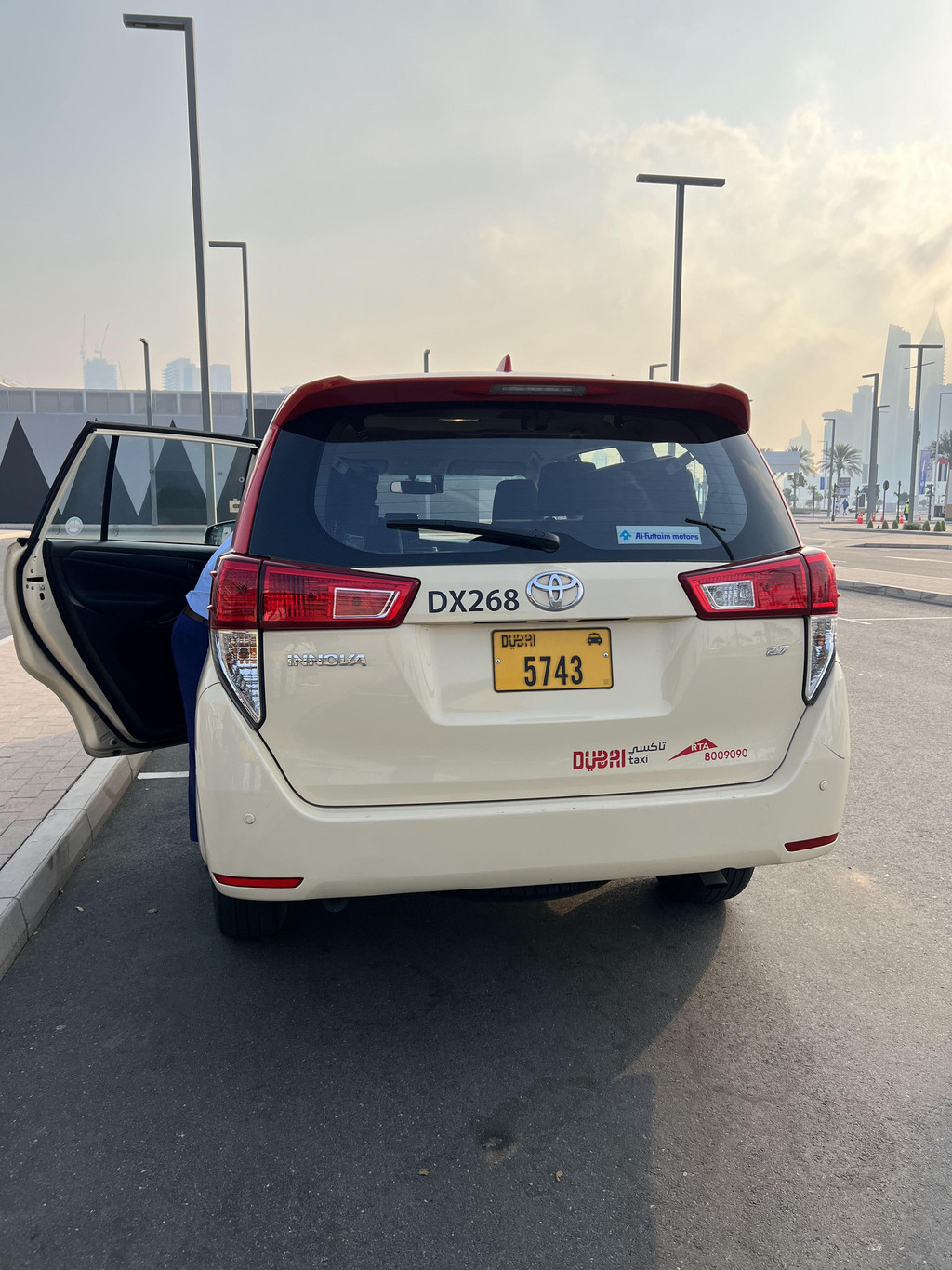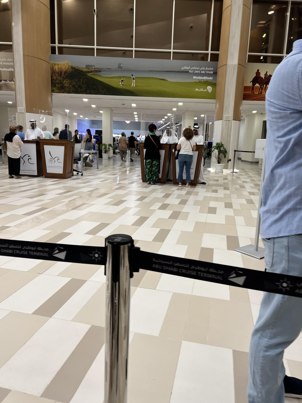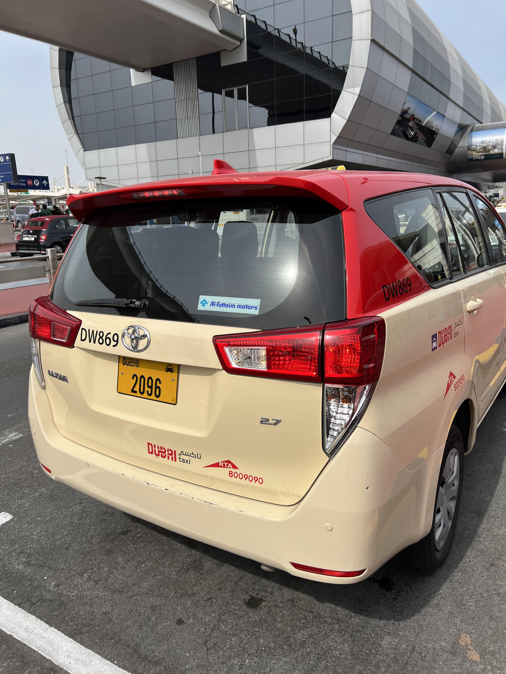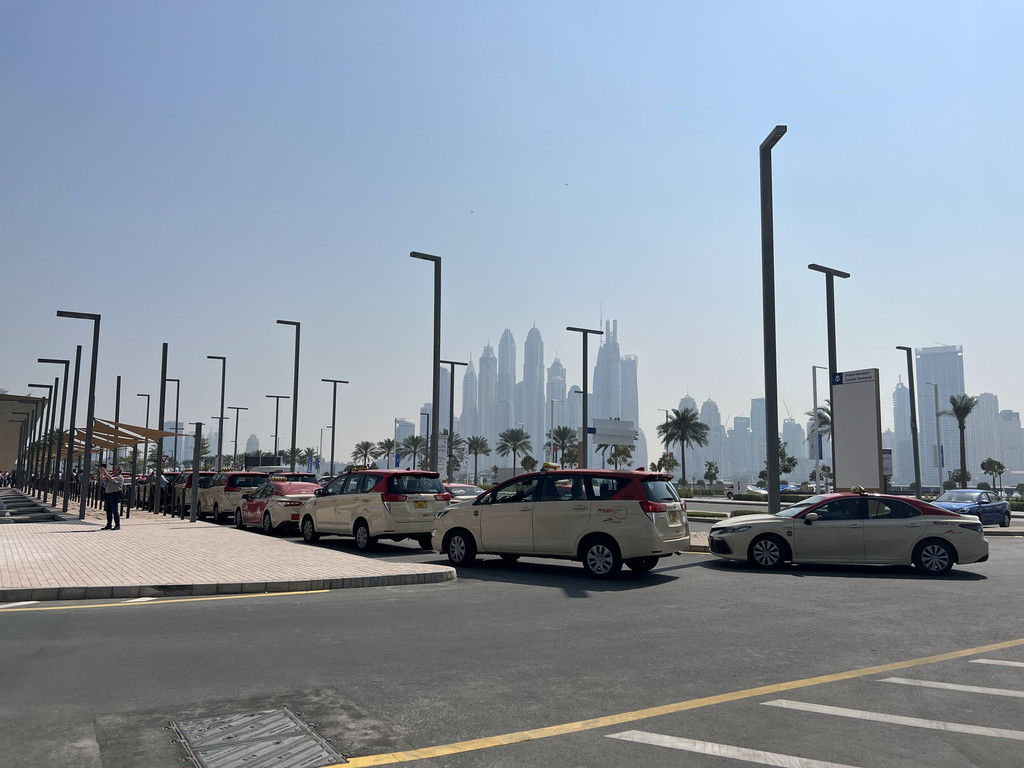 机场出租车都是丰田Innova,是一种介于mpv和suv之间的车型,行李能放很多,设计合理。跟司机交谈说去邮轮码头,司机说有两个码头,一个叫Rashid,另一个叫Mina Jebel Ali,是哪一个。我们初来乍到,听阿拉伯口音极重的英语听得云里雾里,歌诗达的登船牌写的也不清楚,只说是迪拜港。最后去离机场近的那个(Rashid),结果发现只有歌诗达赛琳娜号,和正在进港的地中海欧罗巴号。问了码头的小哥才知道,托斯卡纳号在另一个码头,在朱美拉棕榈岛附近,只能再坐半小时出租车前往。