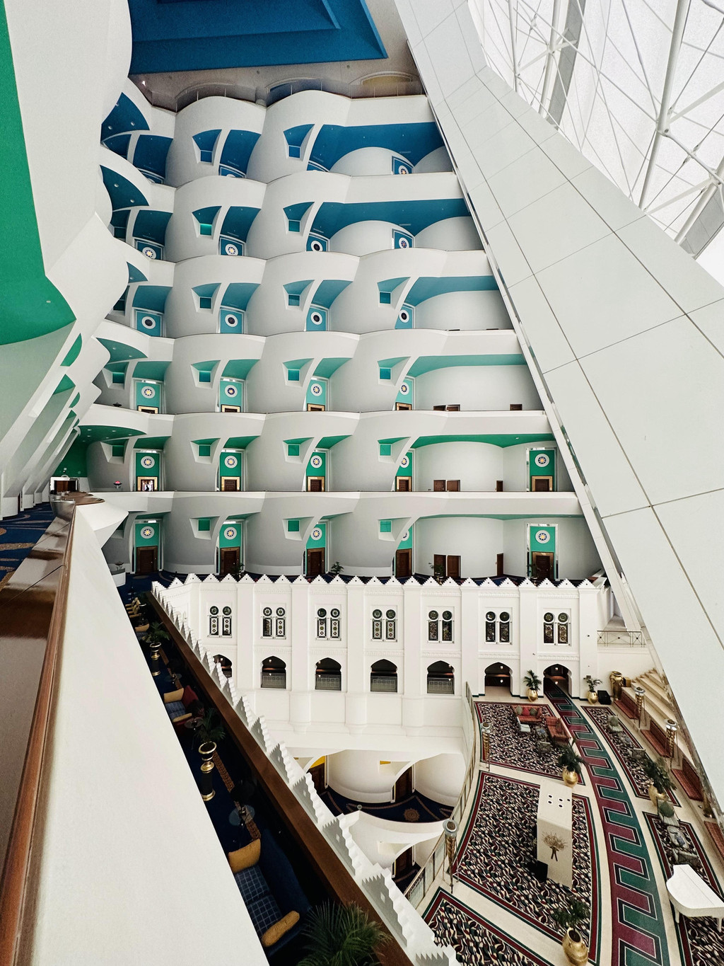 浏览结束后,时间还有多余,只好在房间外部闲逛。帆船酒店内部造型是镂空的,所有房间都是套房,因此价格不菲。