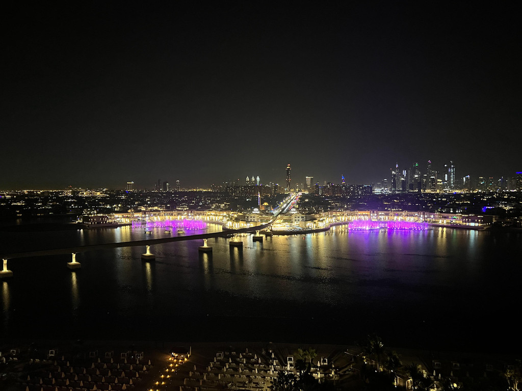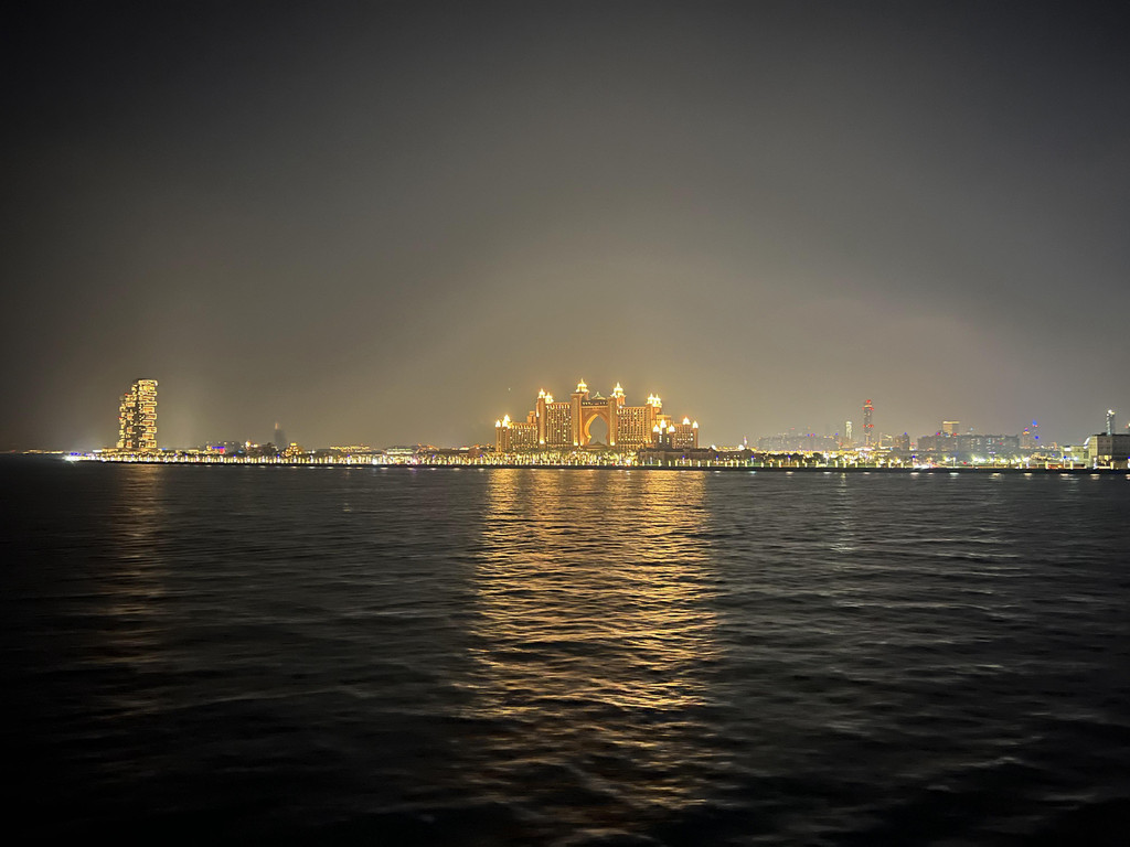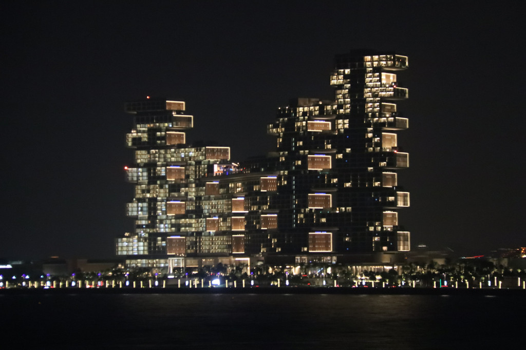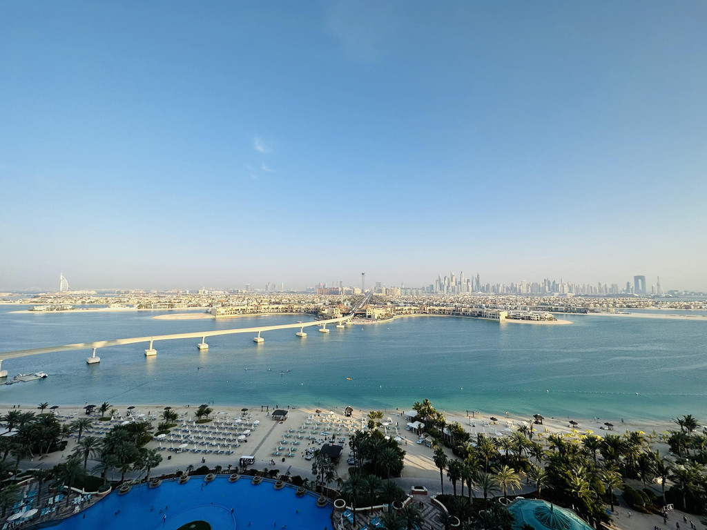 远眺迪拜棕榈岛亚特兰蒂斯酒店,左边的是2023年才开张的亚特兰蒂斯皇家酒店。