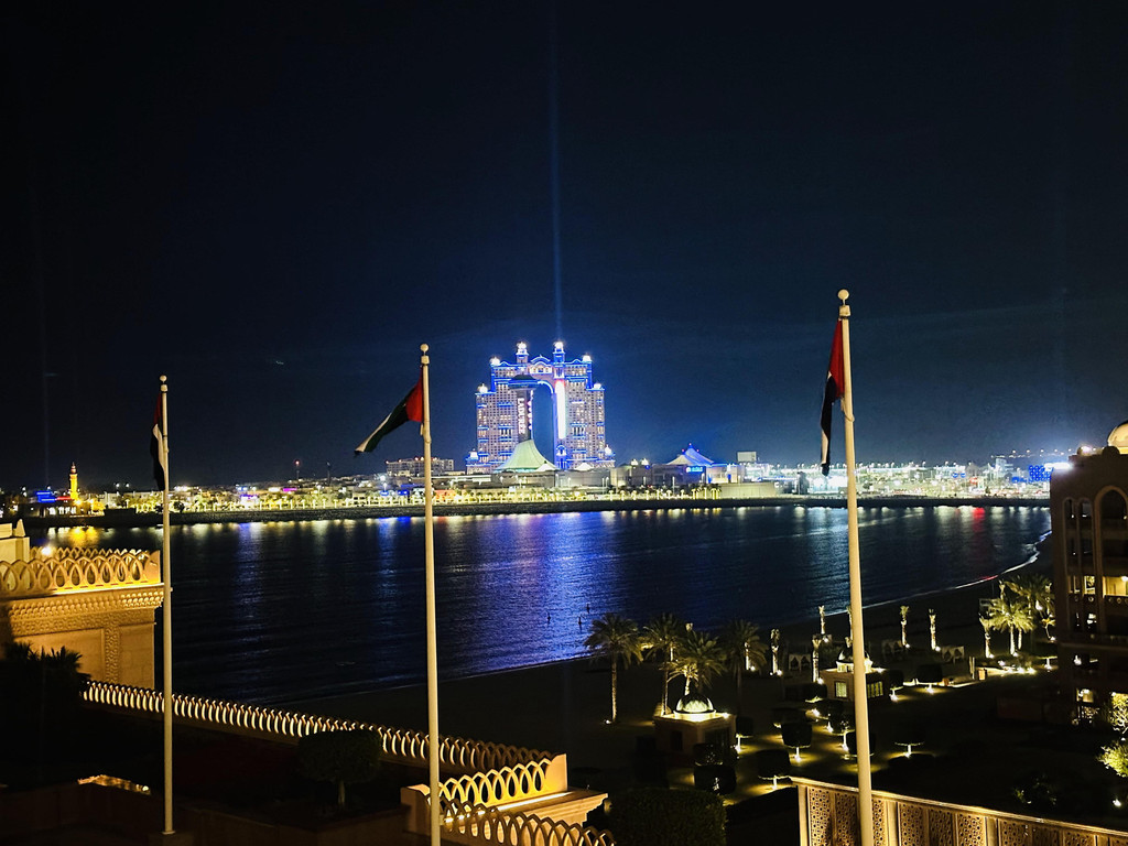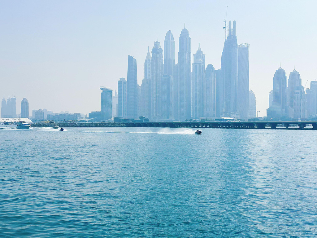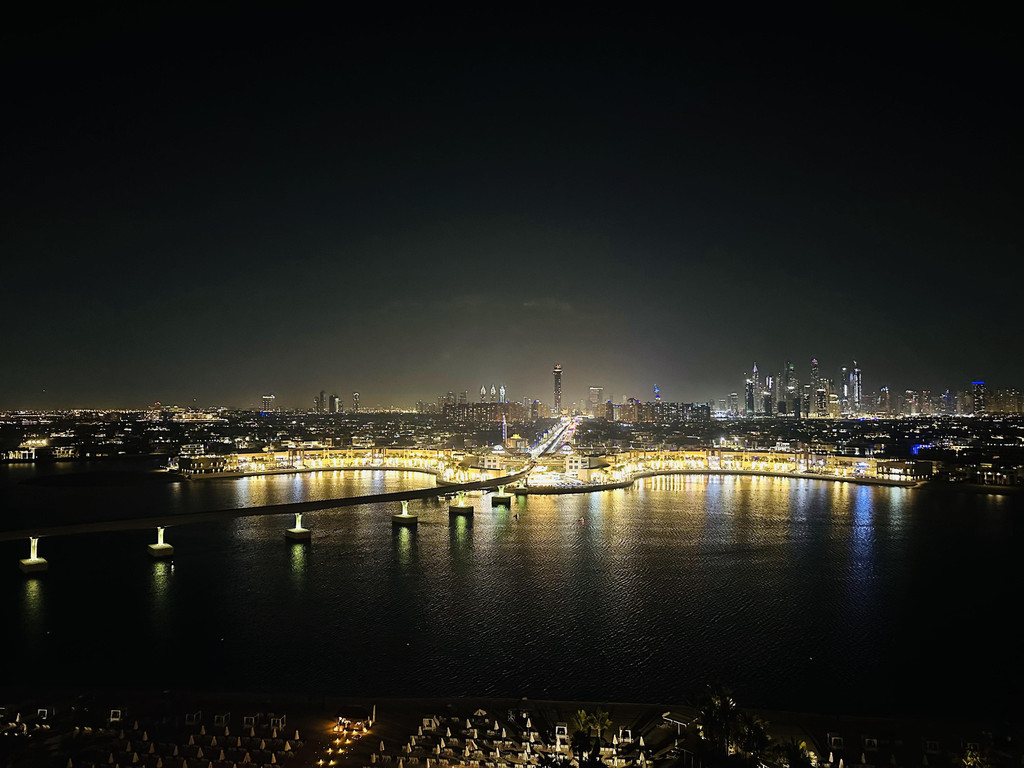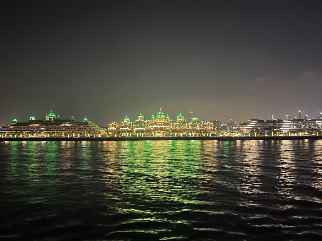 远眺迪拜棕榈岛亚特兰蒂斯酒店,左边的是2023年才开张的亚特兰蒂斯皇家酒店。