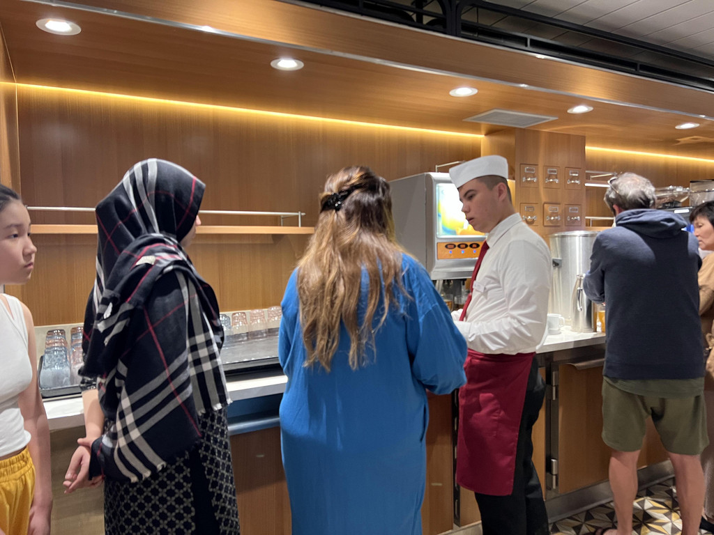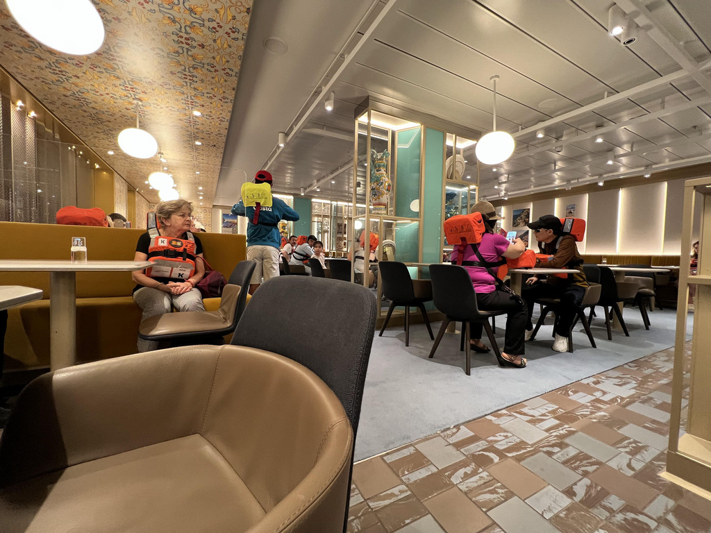 10点吃完早饭后,就回房间带好救生衣到指定地点参加逃生演习,工作人员会手把手地教怎么穿救生衣。虽然参加逃生演习是坐邮轮的必备项目,但是要求穿救生衣还是头一次。由于行程中每个乘客的登船时间不同,因此除了航海日,每天都有新乘客参加逃生演习。