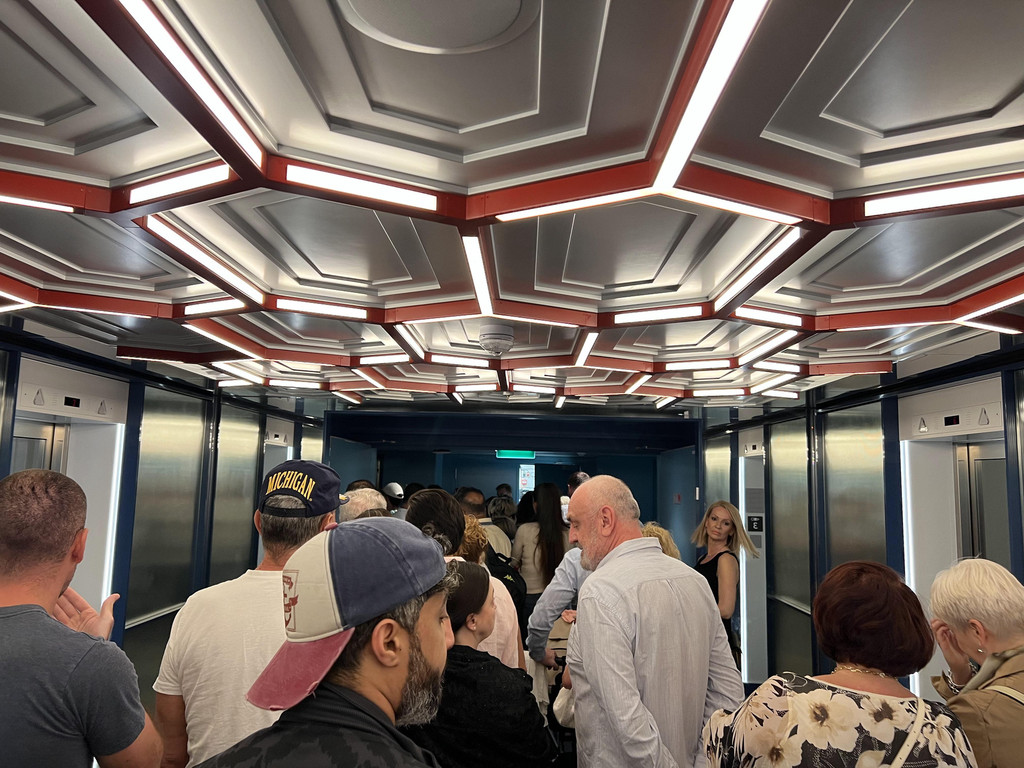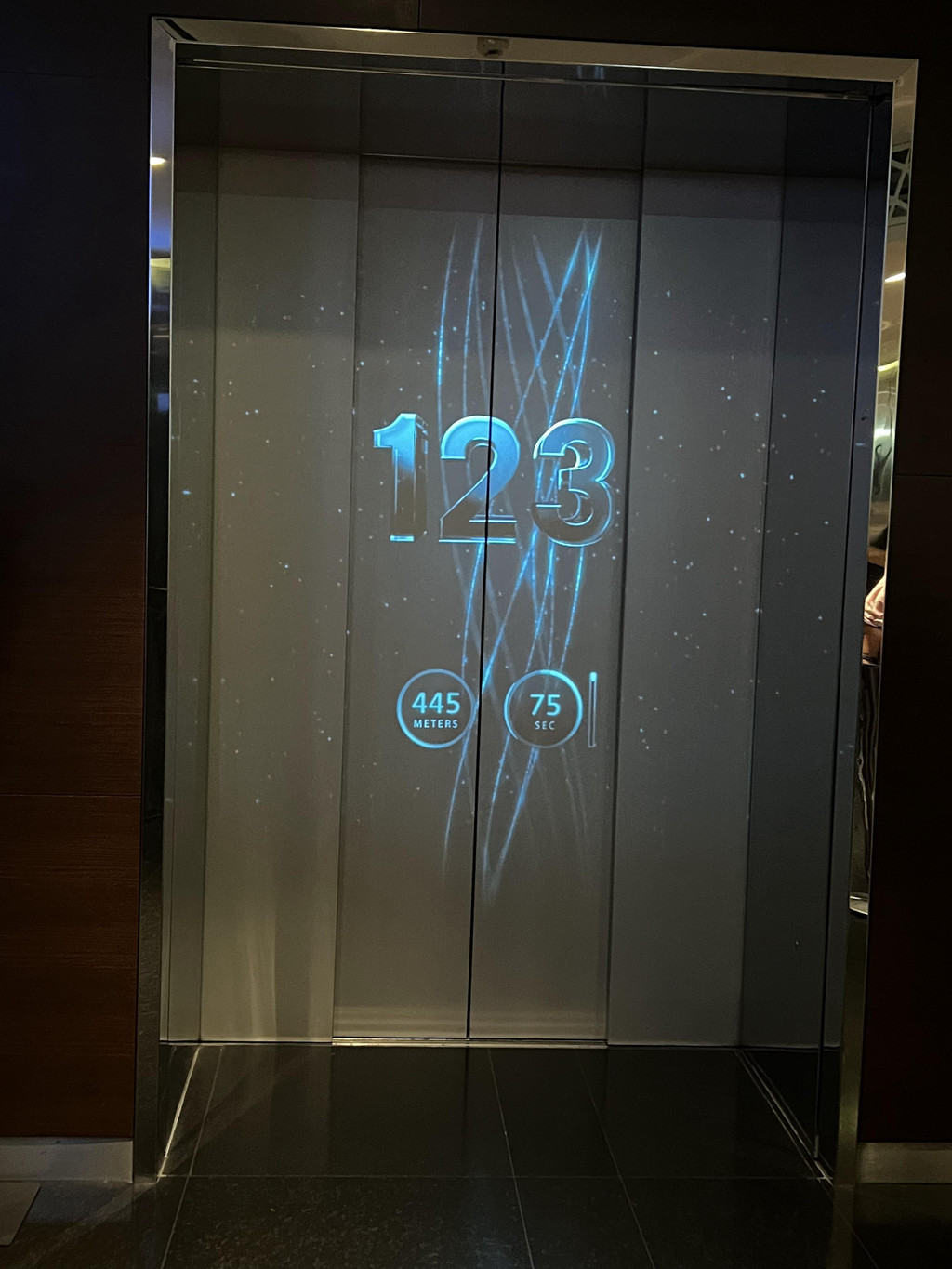 电梯速度非常之快,到123层仅需75秒。而且到vip的楼层需要先到125层,然后再换乘电梯上楼。