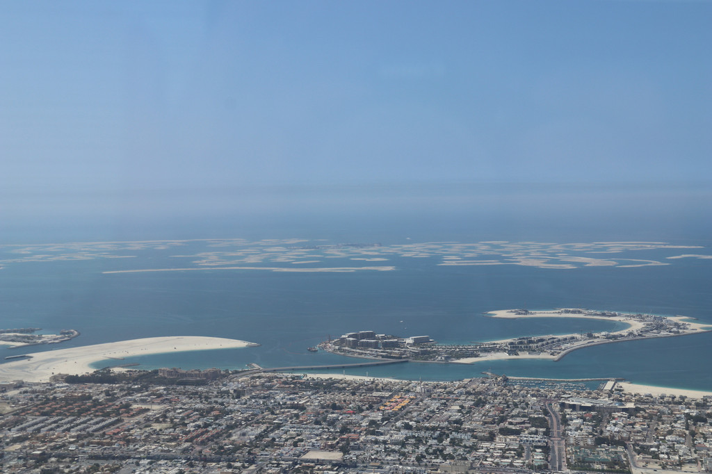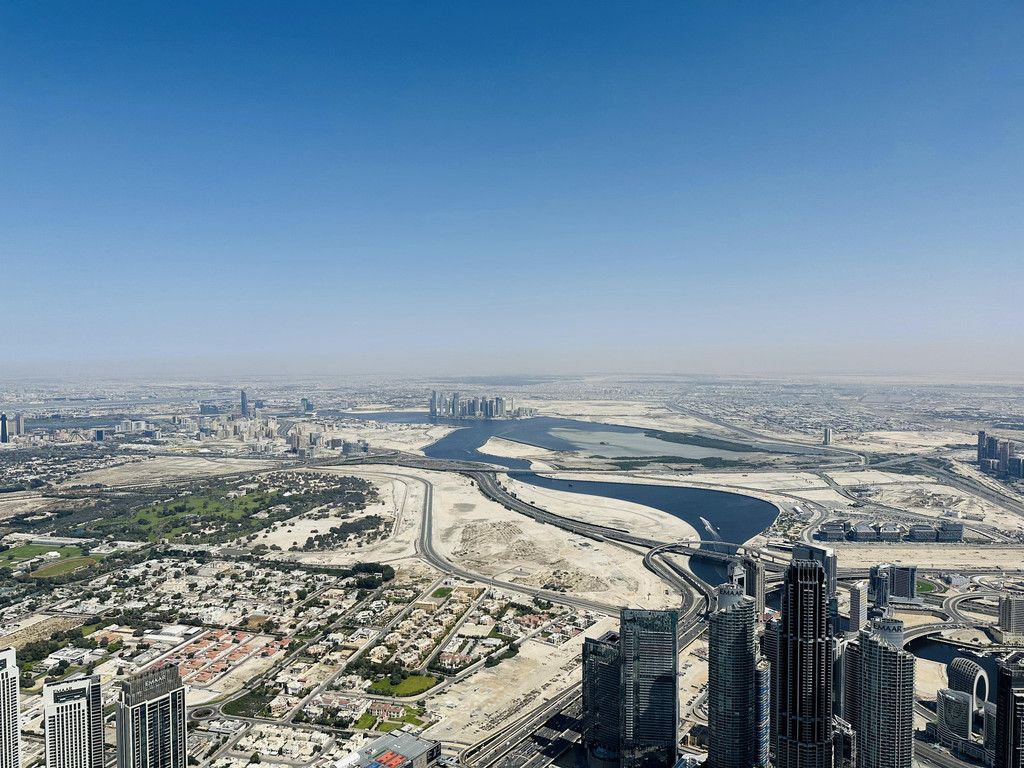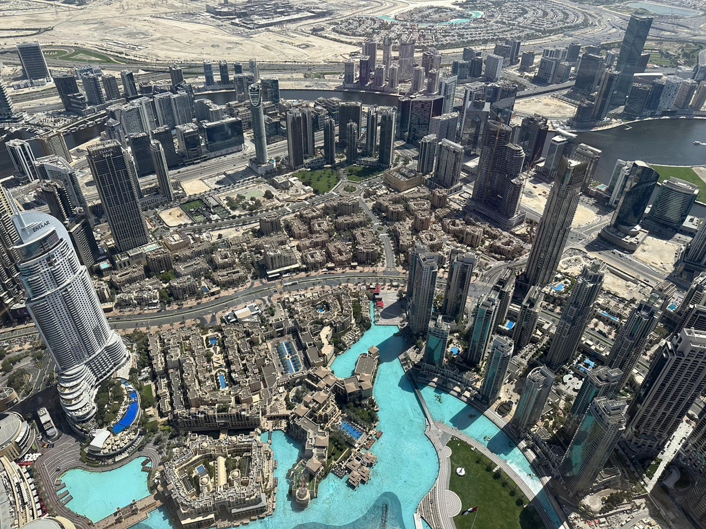 拥有红色屋顶的建筑群就是我们入住的阿拉穆如瑞士酒店。在哈利法塔上当然还能眺望棕榈岛和迪拜码头,但是由于这些地方都在塔的南边,拍照不但逆光,玻璃的反光还会把自己照进去,而且下午又出现了雾霾,所以只能意犹未尽地下楼。