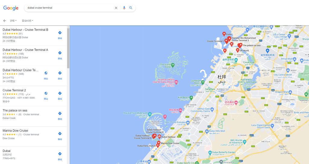 可以看到迪拜有两个邮轮码头,一个在机场附近,一个在棕榈岛附近,两者距离也比较远。