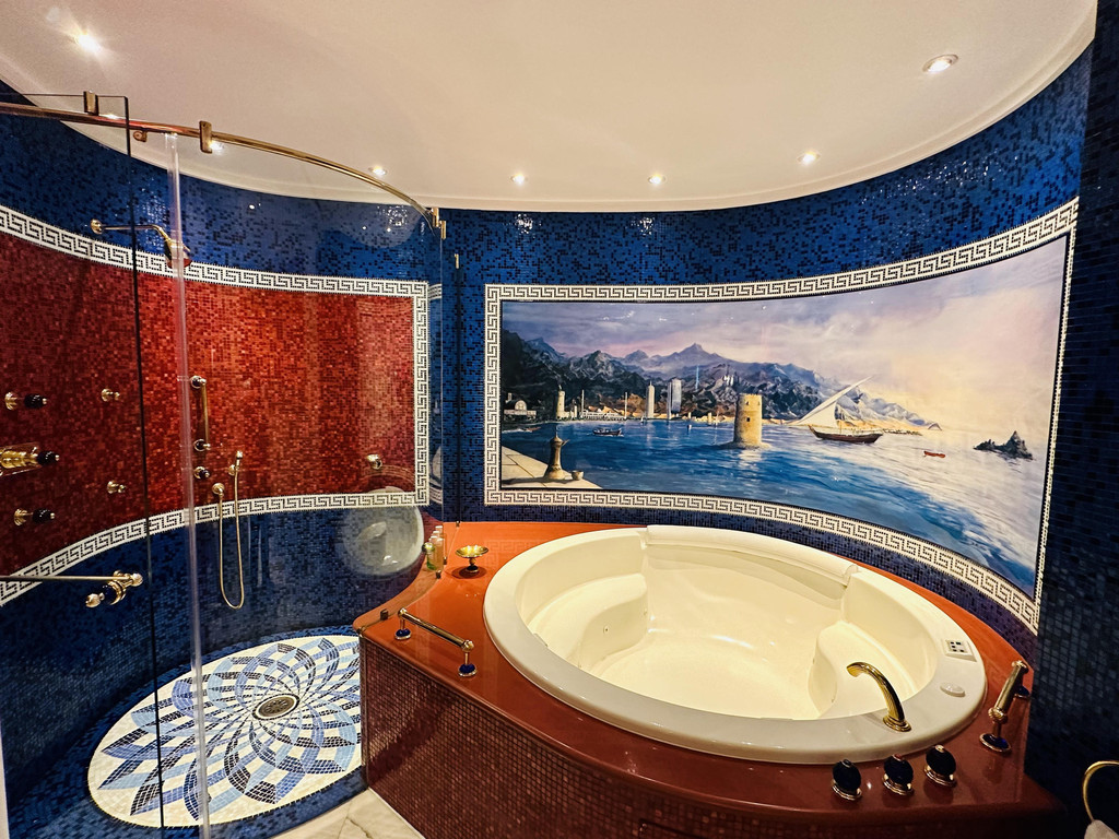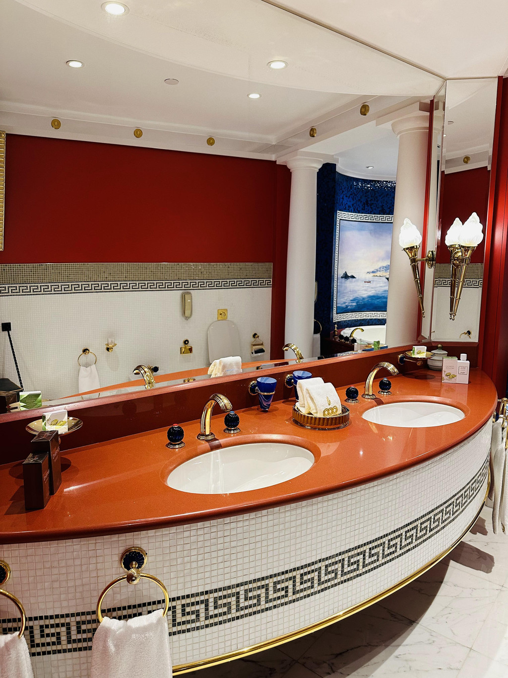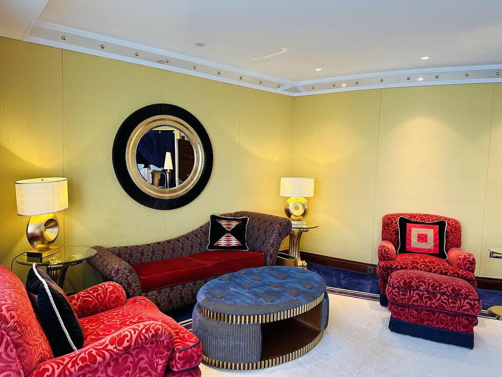 本来预定的豪华滨海套房,酒店方面说免费给我们升级到天空滨海套房,说是楼层高点,也不知道是真的还是噱头。不过房间本身很不错,总共170平方米,一楼客厅二楼卧室,装潢有些老旧但是尽显奢华。