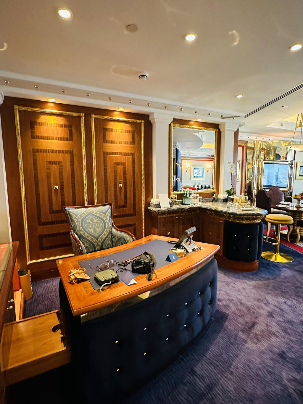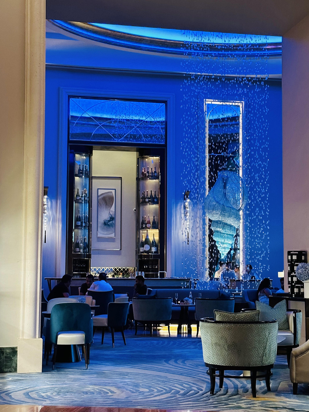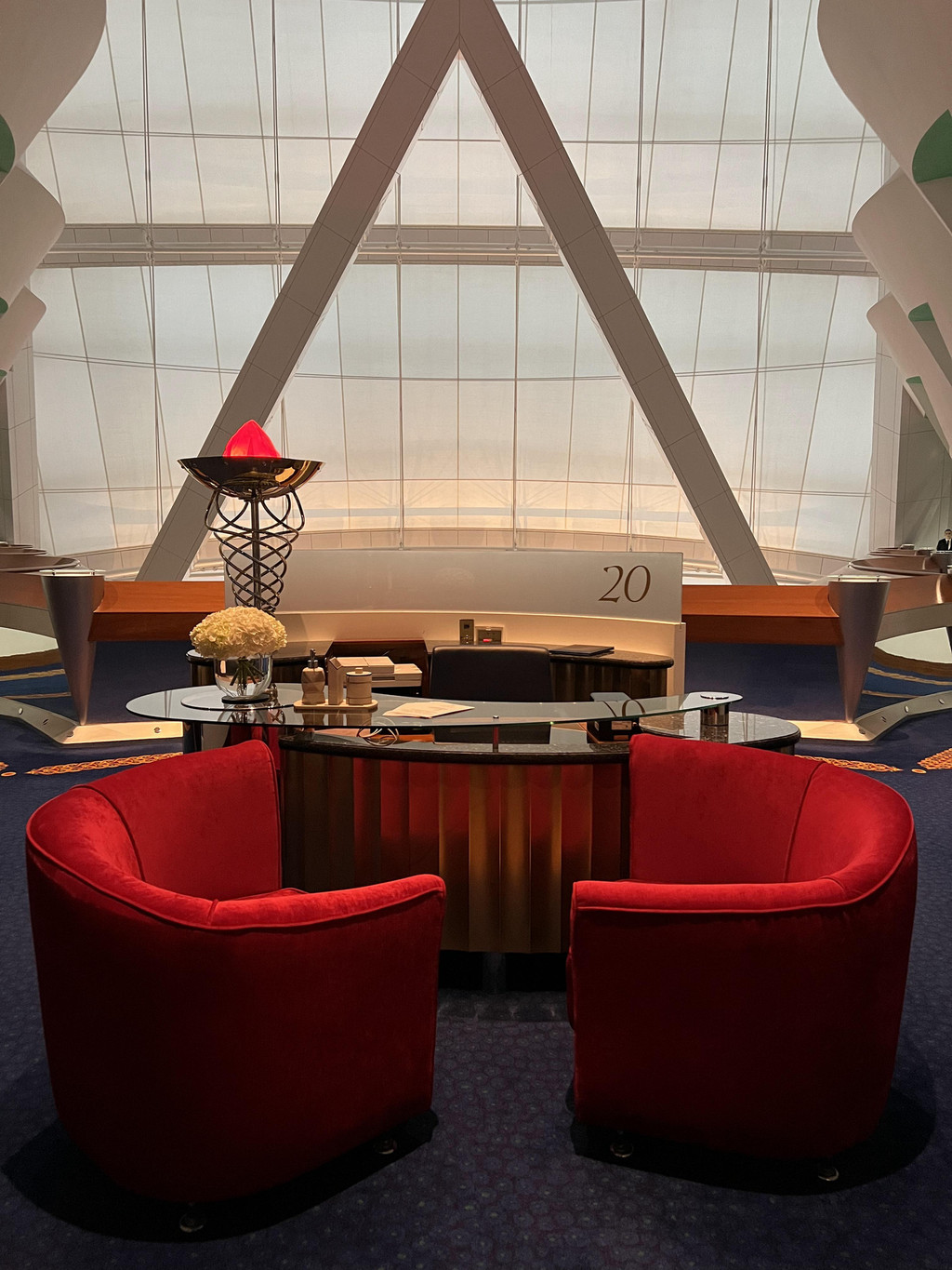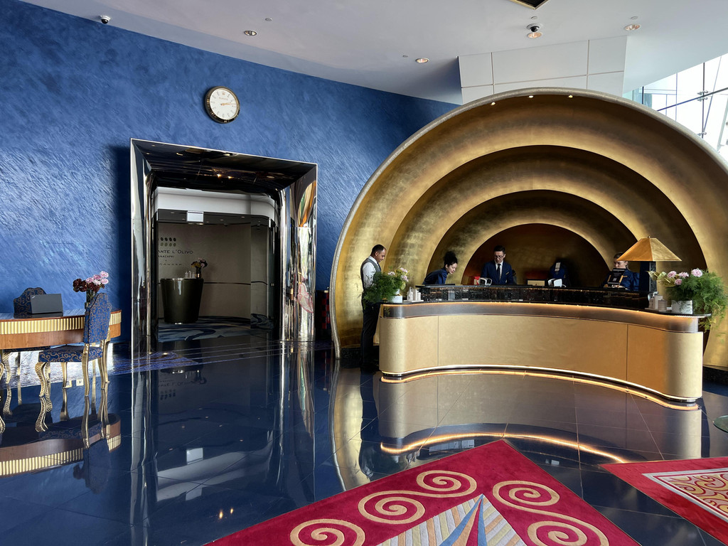 帆船酒店门口有岗亭,会查验客人的信息。在成功核对信息后,通过大桥,造型别致的帆船酒店映入眼帘。由于酒店本身已经变成一个景点,所以可以花费249迪拉姆到酒店内部和皇家套房参观。