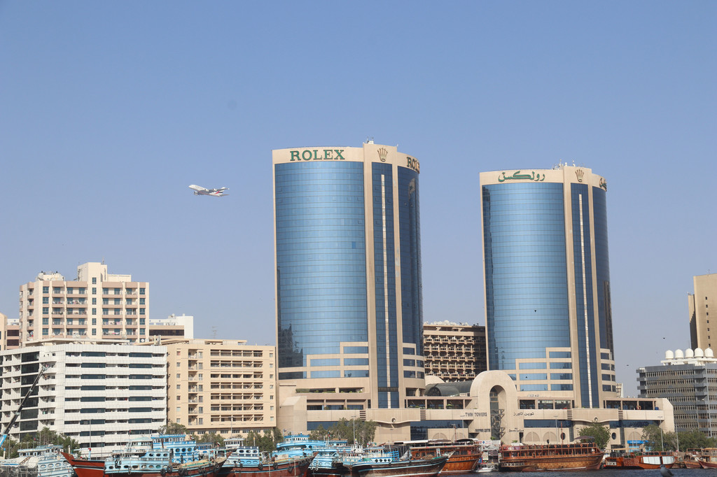 离开香料市场和黄金市场后,回到原来下车的地方等巴士。这时候“都市观光”巴士的劣势就体现出来了,“大巴士”的观光车来了一辆又一辆,我们的车迟迟未来,这就是一分价钱一分货吧。只能看看迪拜河的风景,后面两栋高楼是有名的德拉双子塔(Deira Twin Towers),由于顶部有劳力士手表的广告,所以昵称劳力士塔。