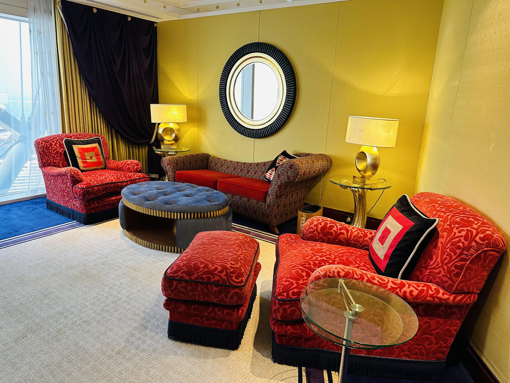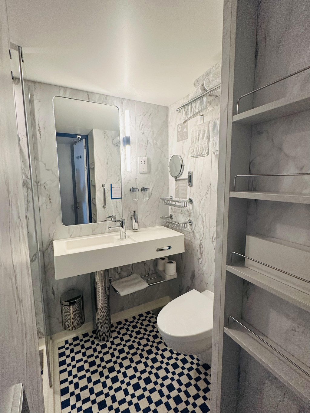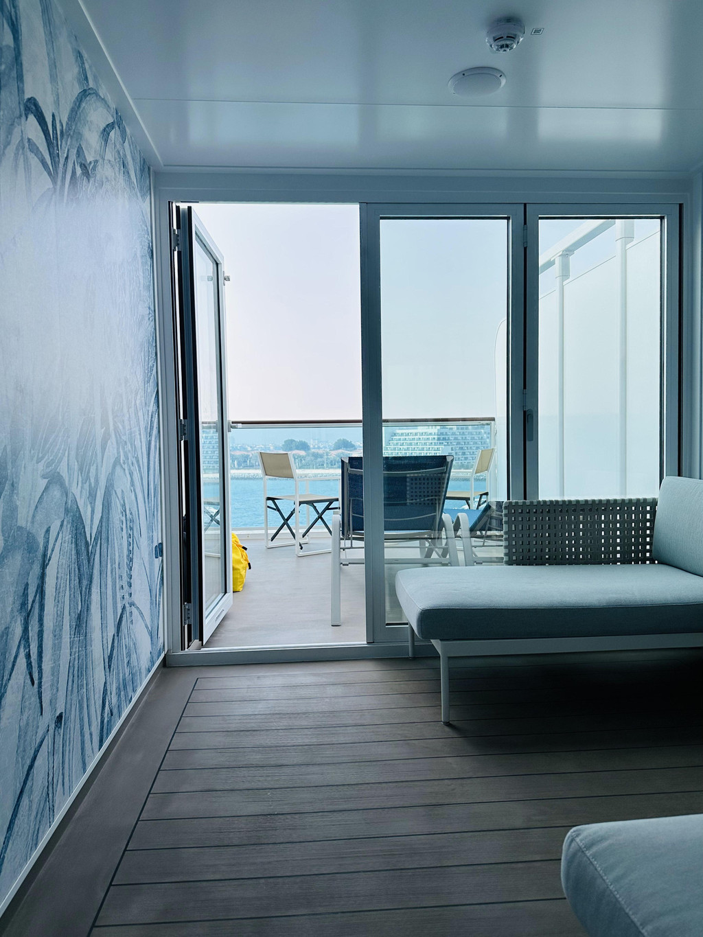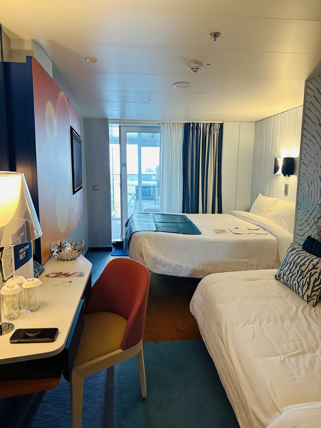 下午三点多,终于登船了。先过海关,上午刚刚入境,下午就出境。然后登船柜台询问是否来自中国大陆和港澳地区,是的话就要求48小时核酸报告。为了同时拥有纸质和电子报告,我们1号就做了核酸,2号拿纸质报告,然后马上再做一次核酸,再拿电子报告。提交核酸报告之后,邮轮方面就把护照收走了,说最后一天再还给我们。(所有游客护照都要收走)历经种种困难,终于到达房间,拥有一张大床和一张沙发床。