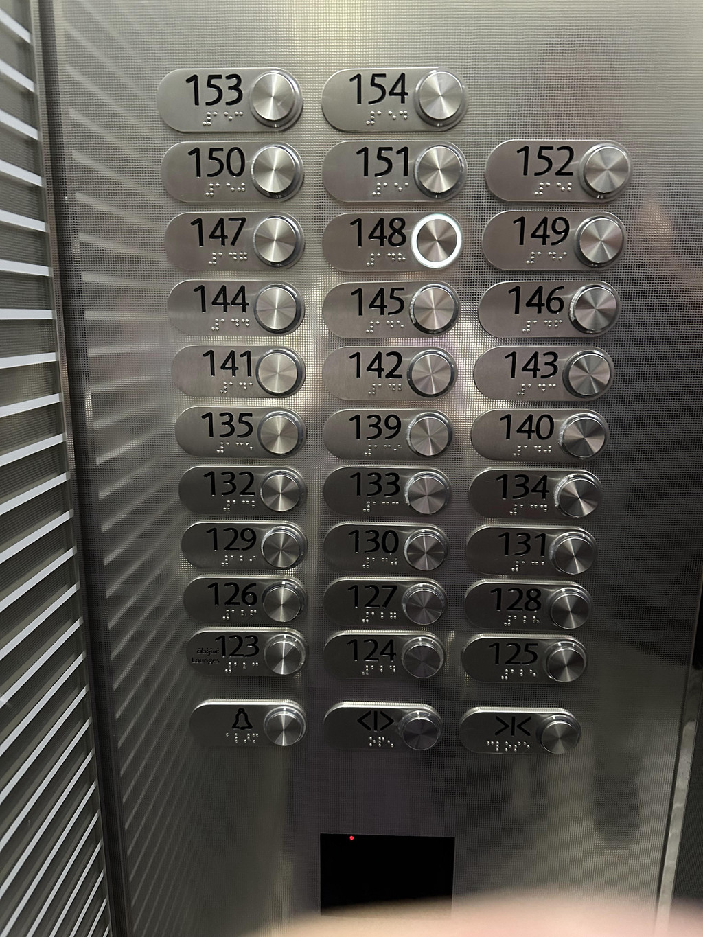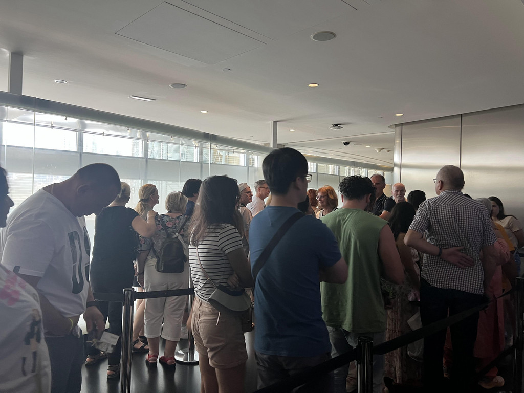 之前做攻略时就有人建议买vip票,因为普通票上去下来都要排长队。我们到了售票处时被告知普通票已经被抢购一空,所以必须买vip票。vip票分两种,两者都可以上125层普通观景平台,优先乘坐电梯,区别在于前者上148层,后者上154层,而且还提供下午茶。