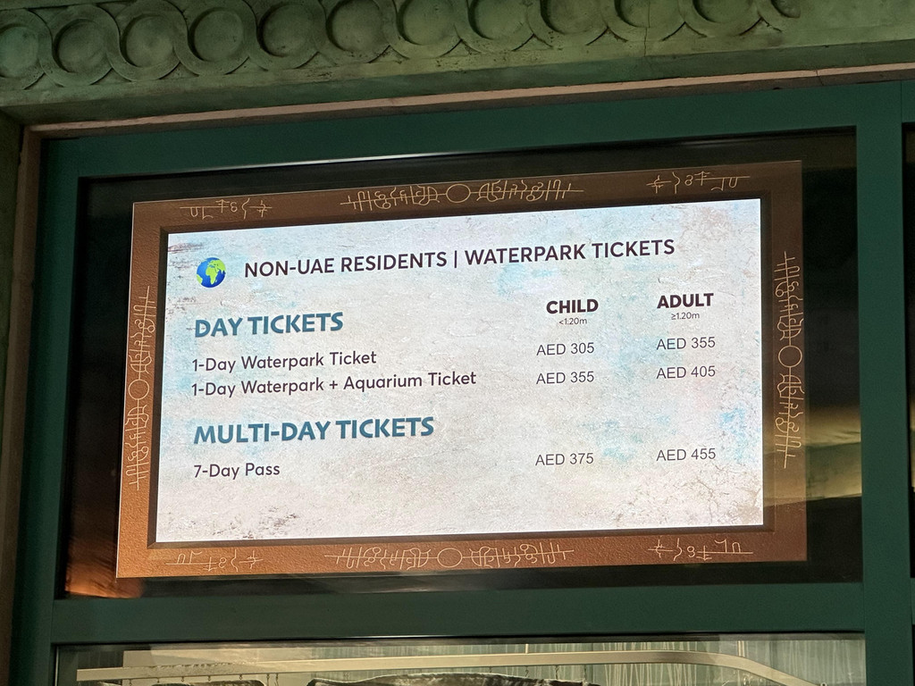 接下来是水世界冒险乐园,票价并不便宜,单独购票需要355迪拉姆,水族馆+水世界联票则需405迪拉姆。当然酒店客人还是可以免费凭房卡随意出入。