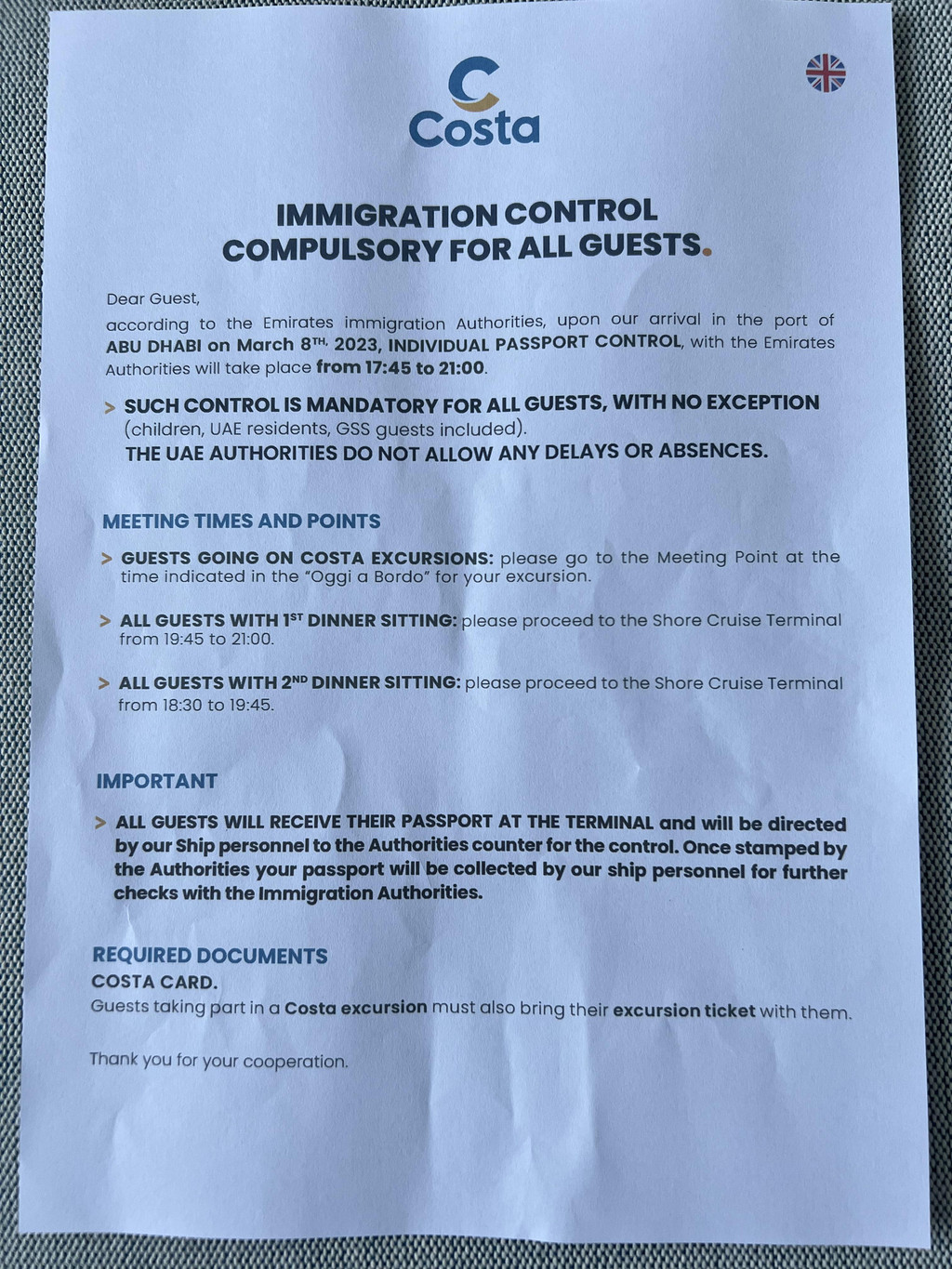 三年疫情,旅游业受到重创,国际旅游和邮轮行业几乎遭到灭顶之灾。疫情稍缓后,全球最大的邮轮客源地美国率先复工,但是需要接种疫苗和核酸检测。随着症状较轻的奥密克戎大规模传播,邮轮公司进一步放宽的政策,在阿联酋航行的邮轮与美国一样,不需要乘客接种疫苗和核酸检测,仅仅“建议”在船上的密集场所佩戴口罩。虽然阿联酋免核酸免疫苗,歌诗达还是要求来自中国大陆和香港的游客必须出示48小时内的核酸报告。这个也不成问题,在国内做完核酸再过去即可。然而卡塔尔也有此项要求,那也就是说,我们在迪拜还要做一次核酸,这就麻烦了。最后赌了一把,根据以往经验,上岸不会查验额外的文件,就没有在迪拜做核酸,再加上船上的大陆游客几乎没有,所以在没有48小时的核酸报告下,最后也登上了多哈的土地。阿曼则没有额外的核酸要求。