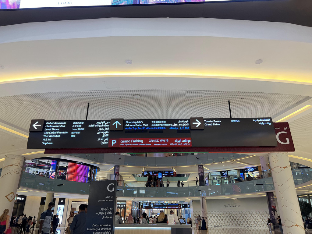 先逛世界上最大的商场——迪拜mall,商店的指示牌有阿拉伯文、英文和中文,其实中文只有在商场的出入口有,大部分指示牌只有阿拉伯文和英文。