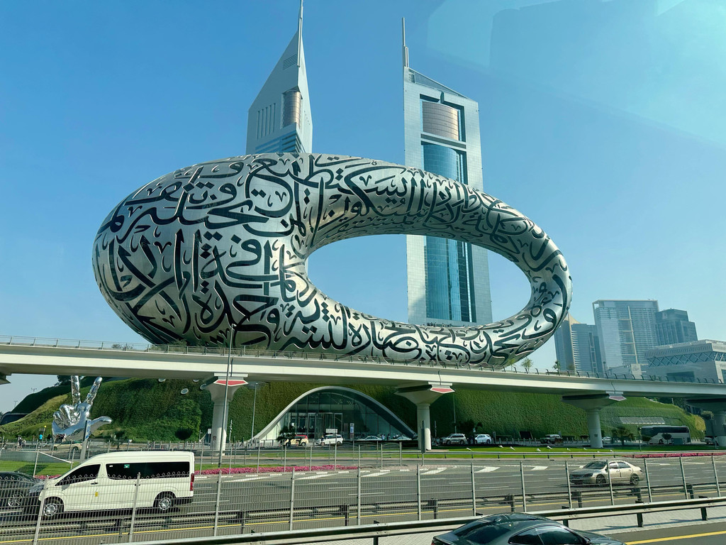 拥有奇特造型的迪拜未来博物馆,镂空设计如同一只洞悉着未来的眼睛。外观将现代与传统进行了完美融合,运用了航空领域特殊的不锈钢无缝玻璃纤维板,由1024块面板拼接而成,其上的阿拉伯文字表达了对未来发展的美好愿景。我们一来对博物馆没什么兴趣,二来时间也不早了,如果下去参观的话,回程就面临无车可坐的局面,所以选择不下车,直接返回码头。