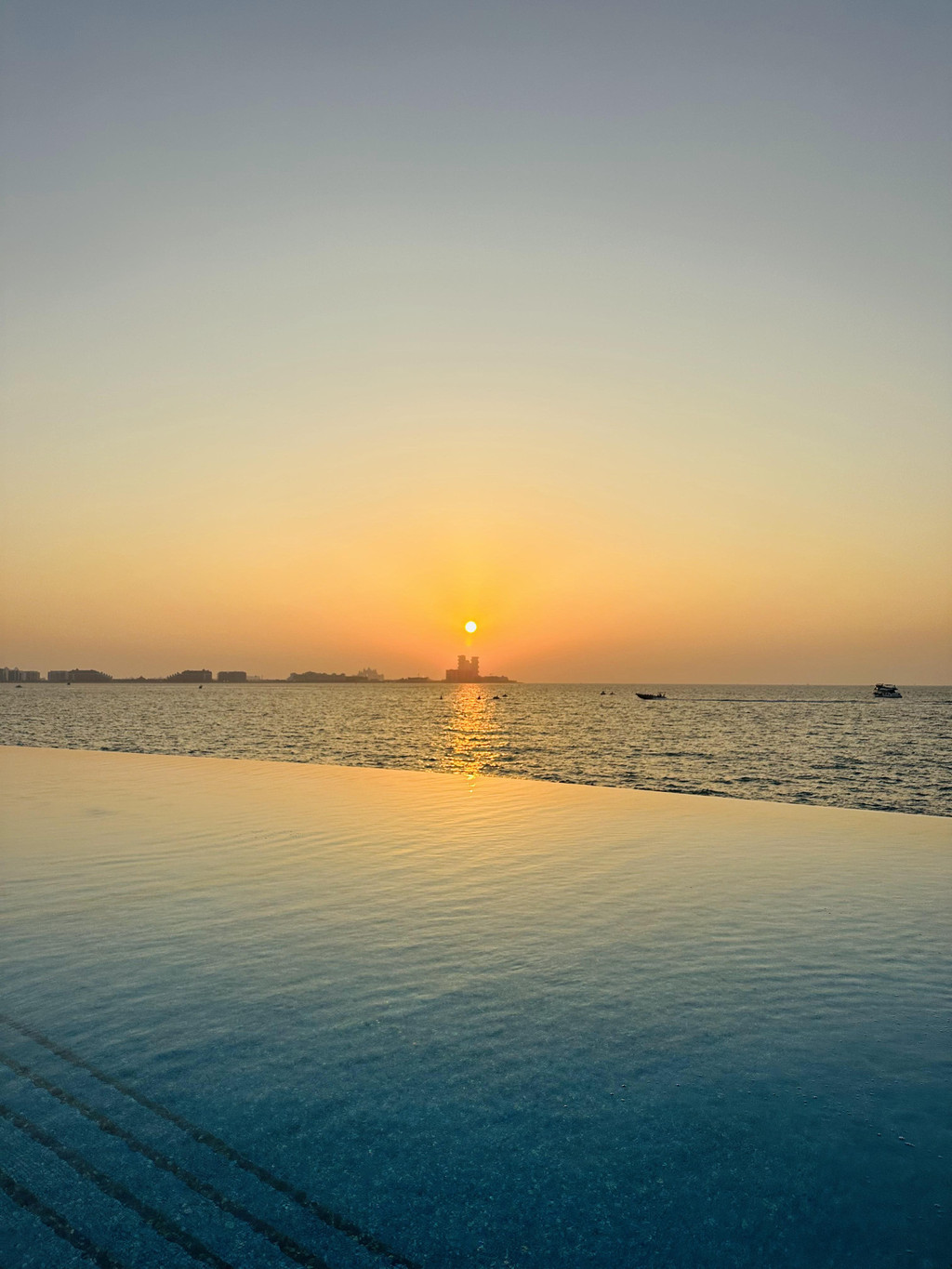远眺迪拜码头和棕榈岛,以及停留在亚特兰蒂斯皇家酒店上方的落日。