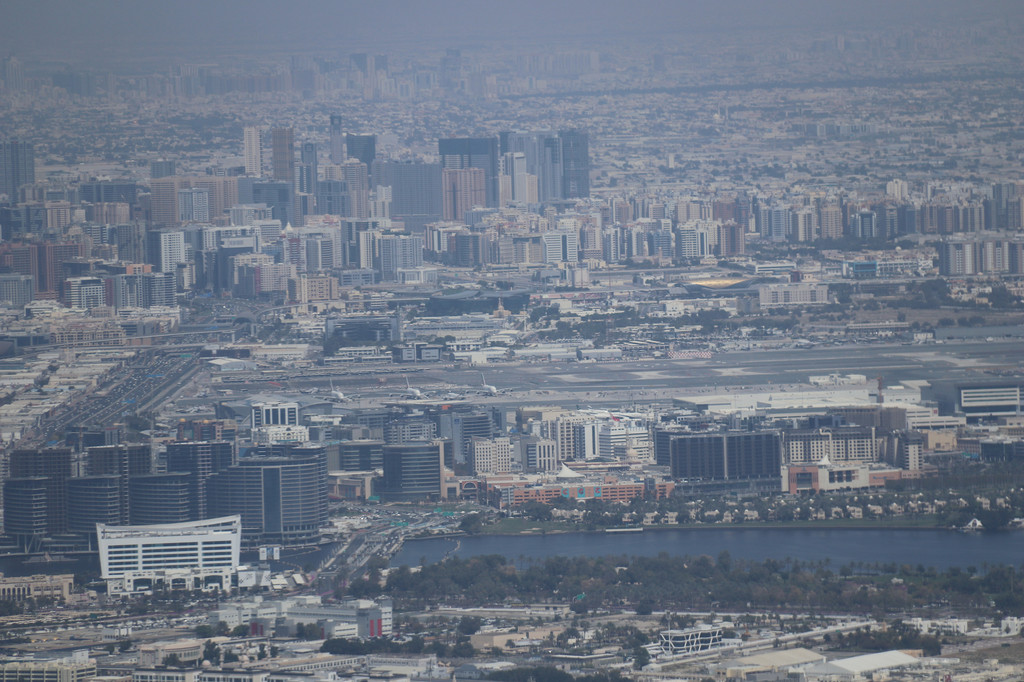 迪拜国际机场就在迪拜老城区附近,在哈利法塔上可以看见一字排开的A380模糊身影。