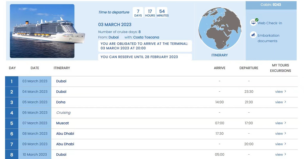自驾的初步计划已经定下,接下来就是邮轮了。本人自从2017年在上海乘坐了皇家加勒比海洋量子号后,就对邮轮旅行产生了极大的兴趣。在接下来的两年里,先后乘坐皇家加勒比海洋和悦号(当时为世界第一大邮轮,一个月后该宝座被同级别的海洋交响号夺走)、诺唯真畅悦号、海岛公主号、诺唯真美国之傲号和皇家加勒比海洋光谱号,路线涵盖加勒比海、阿拉斯加、拉丁美洲、夏威夷以及东南亚。23年初开放国门后,在网上无意间看到新下水的21.5万吨的地中海欧罗巴号正在中东航行,才知道中东也有邮轮航线,只不过是季节性的,基本是11月到3月。地中海欧罗巴号作为地中海邮轮新下水的旗舰,也是众多邮轮中极少超过20万吨,可以跟皇家加勒比绿洲级掰掰手腕的巨轮,自然得到了本人的青睐。然后上官网一查才发现,整个中东行程的所有房间(套房除外),都被抢购一空了!(几天之后连套房都没了)在失望之中,只好退而求其次,在为数不多的选择中找到了歌诗达托斯卡纳号。本人对歌诗达的印象没有对其他邮轮公司那么好,一是歌诗达曾经在2012年出了协和号那么可怕的事故并且处理不当,二是虽然没有坐过歌诗达,但是乘坐歌诗达赛琳娜号的乘客给本人留下了不太好的印象。但是托斯卡纳号的航线很不错,不仅会在迪拜和阿布扎比各停留两天,还会前往卡塔尔首都多哈和阿曼首都马斯喀特。该邮轮是歌诗达最大的邮轮,吨位超过18.5万吨,在目前全世界所有邮轮中排名第八,而且还很新,2021年底才下水。考虑到飞到阿联酋是清晨5点,还要倒时差,所以决定先坐邮轮,精神彻底养好后再自驾。至此,邮轮的初步计划也已定下,接下来就是复杂且繁琐的行前准备。