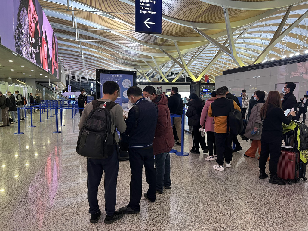 过海关之后安检又查了所有的东西,连鼠标电源线都要单独拿出来,明显变严格了,飞机于11点准时起飞。图为正在进行健康申报的乘客们。