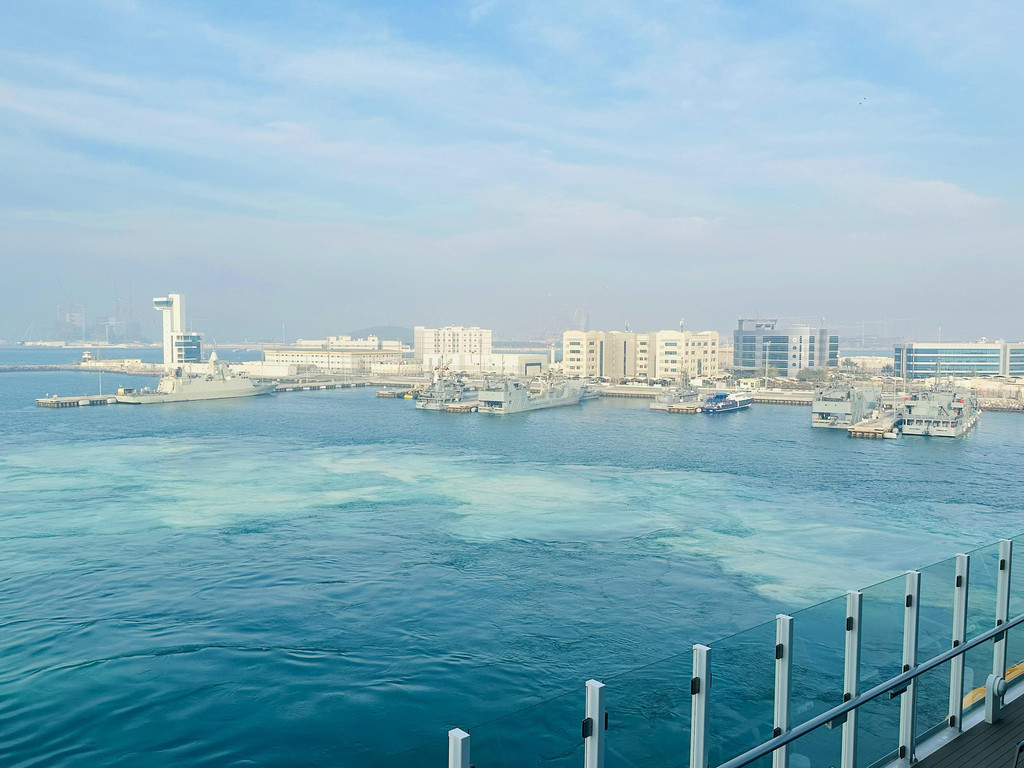 不远处就是迪拜的另一个名叫Rashid的码头,停泊着两艘地中海邮轮,左侧为地中海歌剧号,右侧就是原本要乘坐的地中海欧罗巴号。而且该码头离迪拜老城区很近,如果托斯卡纳号停泊在这里的话,我们也没必要坐观光巴士,可以直接步行到老城区和黄金市场。