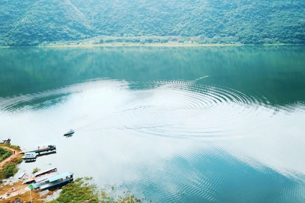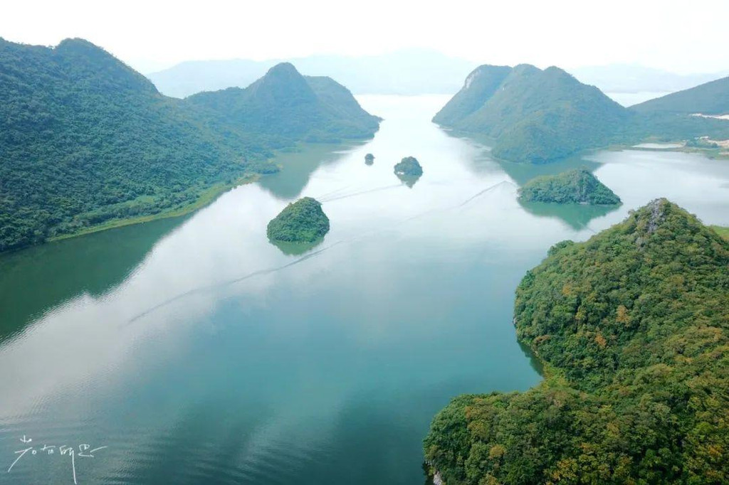 升高无人机,大大小小的山丘散落在湖面,水面平静的倒影着青山,美的如一副山水画。