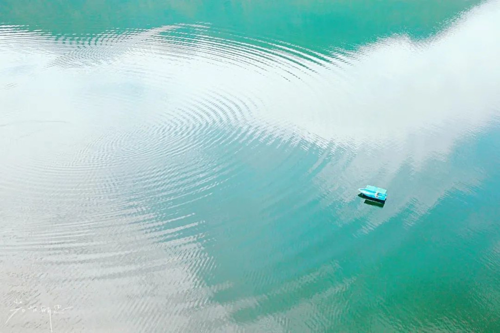 是个多云的天气,湖中间的一艘小船静静地。让我想起徐志摩的那句:我是天空里的一片云,偶尔投影在你的波心。