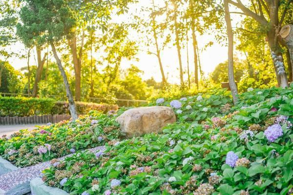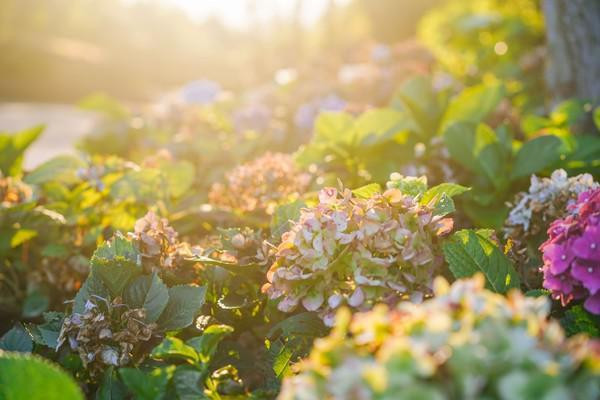 黄昏的时候,山顶的绣球花沐浴在金黄色的阳光之下,显得格外的好看