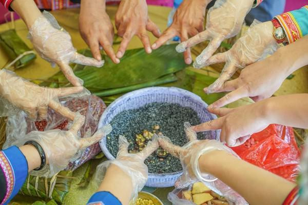 来到观音山以后,大家就摆好了材料准备上手包粽子了,这一次来的以女性瑶族朋友为主,大家都很灵活,不会的还有人教,所以粽子一下就包好了。