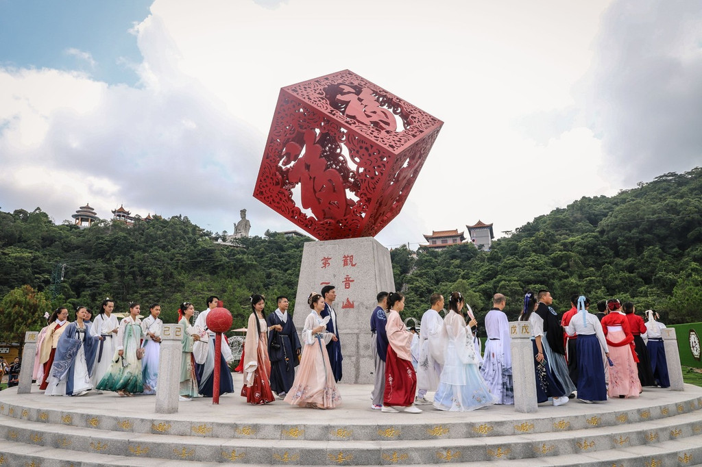 在观音山第一福前,各组汉服CP分别排着队上前转福、接福。先是两个人共同转动转盘后,再手牵手绕着第一福走三圈,以此接收满满的福气,期盼爱情美满、家庭幸福。