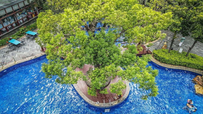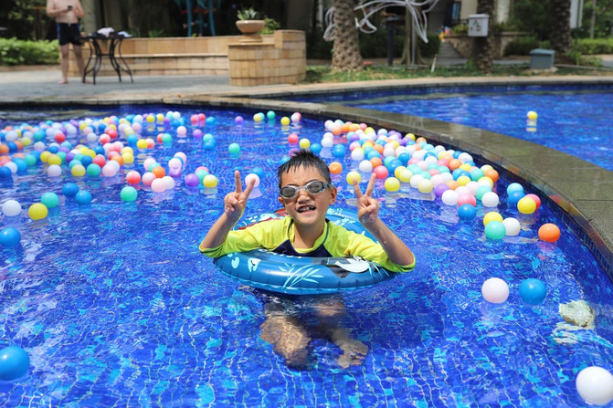 玩了一圈下来,浑身都是汗,嚷着太热了,就带着他回三正半山酒店的游泳玩了一会,休息了一下。