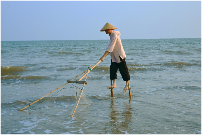是 中国 大陆与 越南 交界处的巫头、万尾、{山心} 三个小岛。位于 防城港 市 东兴 开发区江平镇南面 临海 处,与 越南 隔海相望,那里生活着 中国 唯一的海洋民族。在京族 三岛 海边,经常会看到这样的场景:渔民们带着斗笠,手里拿着渔具,踩着高跷站在海 水里 捕鱼、耙螺、挖沙虫、虾灯捕虾等等。高跷捕鱼算得上是全世界独一无二的人文景观,曾一度在 斯里兰卡 引人注目。或许也是因为高跷捕鱼,京族 三岛 还被称作“小 斯里兰卡 ”。在金滩上与正在捕鱼的京族老叟闲聊,无处不体现出他们因海而生,傍海而居,当地人因海而得福,从而对海洋抱以的畏惧之心、感恩之心、企盼之心。