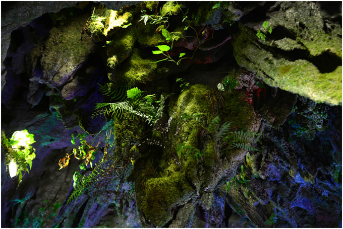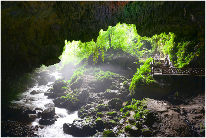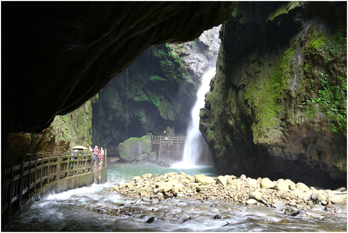 入峡谷的小径从遮天蔽日的枯藤老树下穿越下坠,宛如一条绿色的隧道通往地心,往下约300米处是古石垒,迎面一堵绝壁挡住去路,近看却有个洞口。入洞后,竟是一个高100米通灵大瀑布、宽60米的宽敞的溶洞。深深的洞底水流潺潺,洞顶呈一线天,洞壁及洞顶布满各种造型奇异的钟乳石,从Z字形的云梯下到洞底,出洞后是一片遮天蔽日的原始森林。