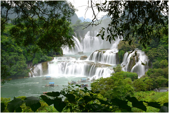德天瀑布位于 广西 壮族自治区 崇左 市 大新 县硕龙镇德天村,瀑布气势磅礴、蔚为壮观,与紧邻的 越南 板约瀑布相连,年均水流量约为 贵州 黄果树瀑布的三倍,为 中国 国家AAAAA级旅游景区 。 还是《酒是故乡醇》和《花千骨》的外景拍摄地,神奇而美妙。