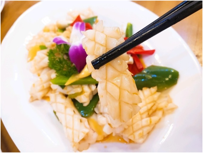〔姜葱鱿鱼〕很好的利用姜葱把鱿鱼的鲜甜给调出来,可以说这道菜是Q弹可口的。鱿鱼的刀花也切得很美。