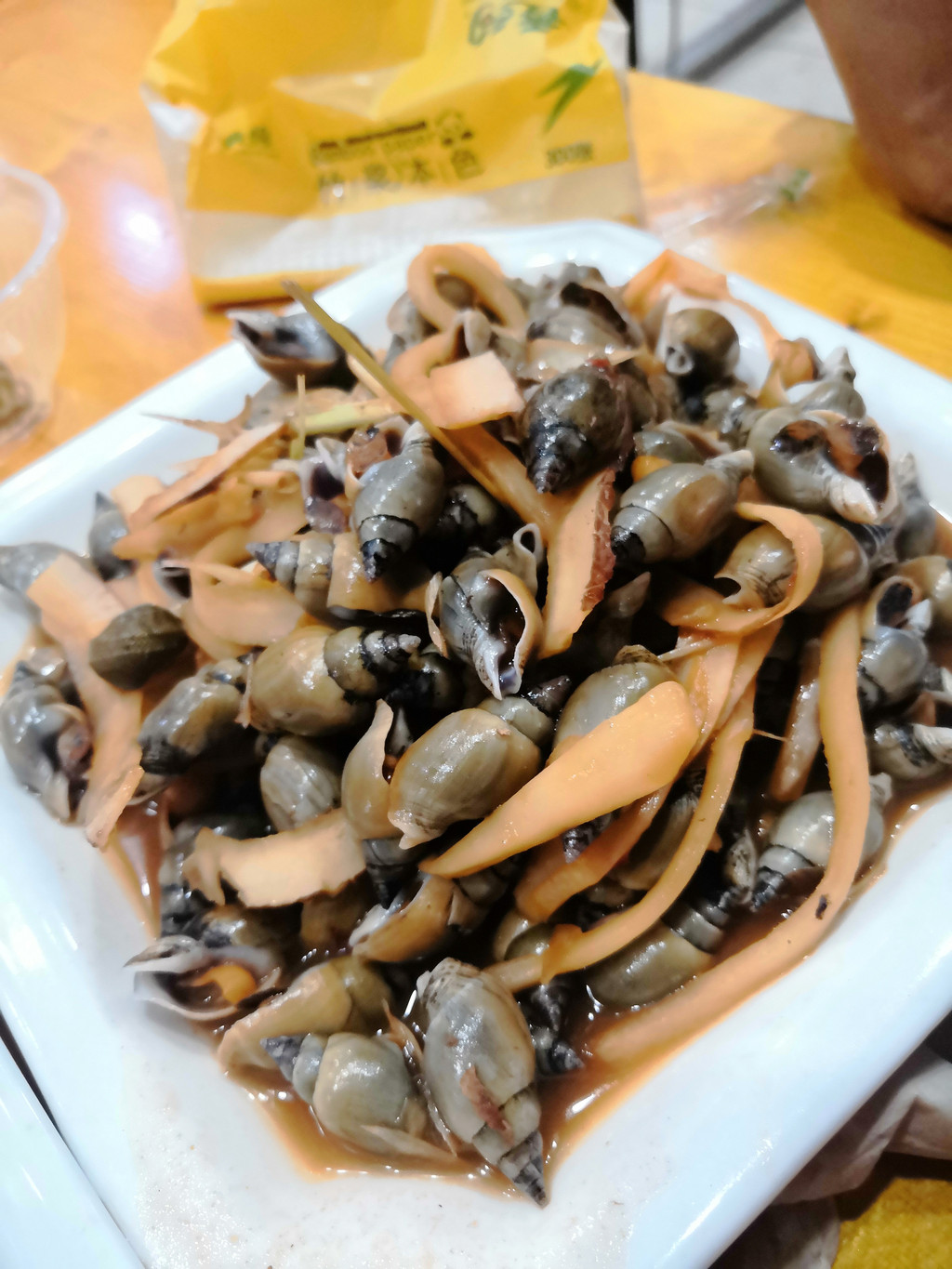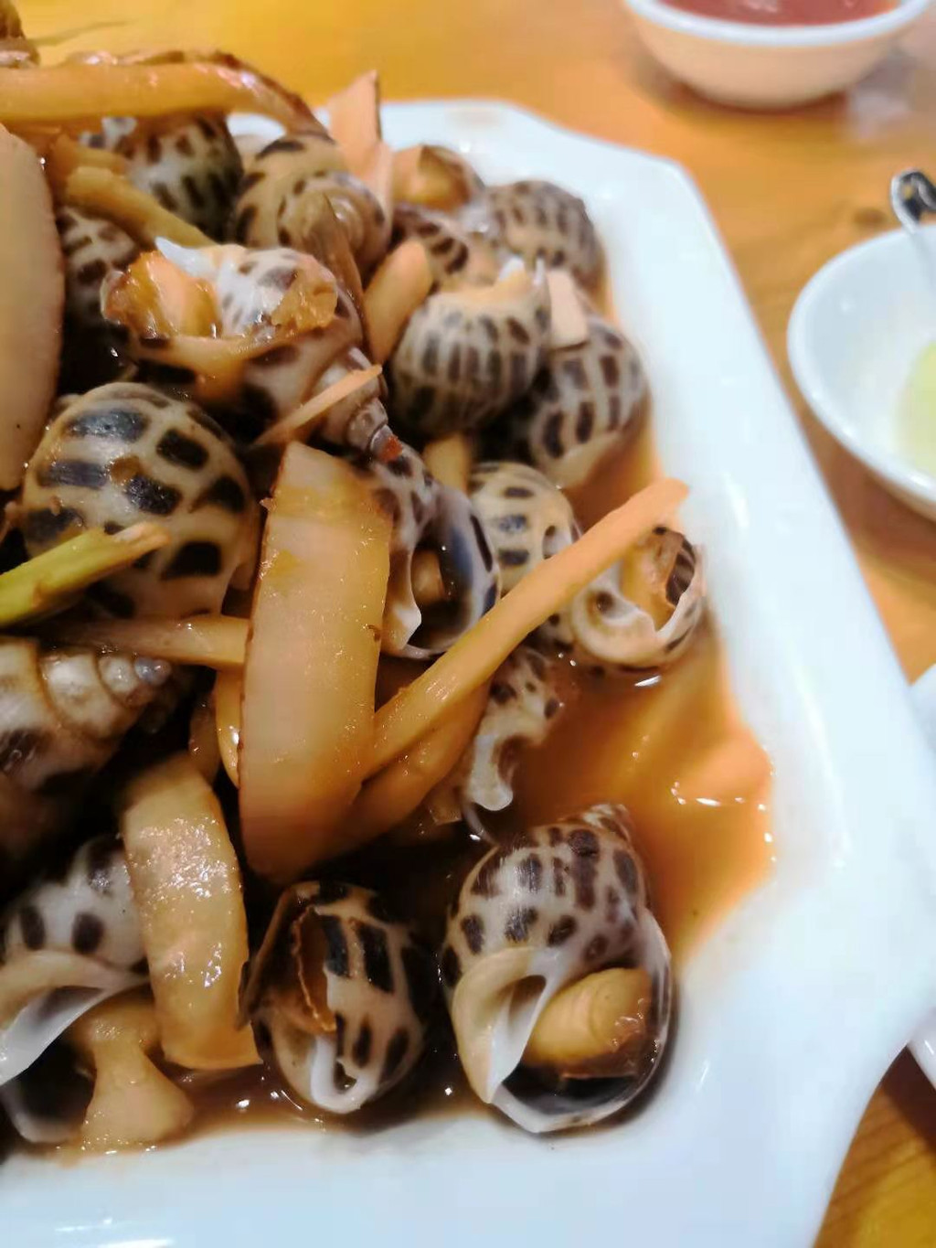 其实店就在我们住的酒店后面不远,我们住的河堤路的哪家维也纳酒店,我们一进炒螺店就看在座的食客们吃的是啥,并叫他们推荐!果然没有推荐错,价格略贵,3份炒螺好像是140多元,但是胜在好吃!